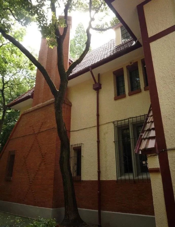 建筑的外墙使用拉毛水泥与红砖相间,立面造型变化较多,色彩层次较丰富,平添了较好的立体效果。建筑师还有意使北立面山墙的木架外露,这是许多英式住宅的明显特征。