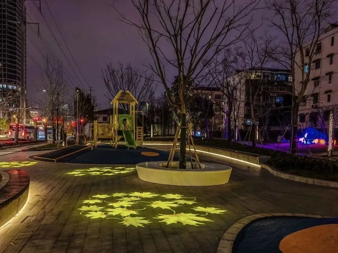 而榆兰新村沿街的座椅及树池边缘,同样进行提亮装饰,用暖色调烘托,给市民如家一般的温馨感。同时还设置了仿生造型的庭院灯,在保障环境基础照明的同时,与周边绿植的风格相得益彰,给市民营造似自家后院的舒适感。