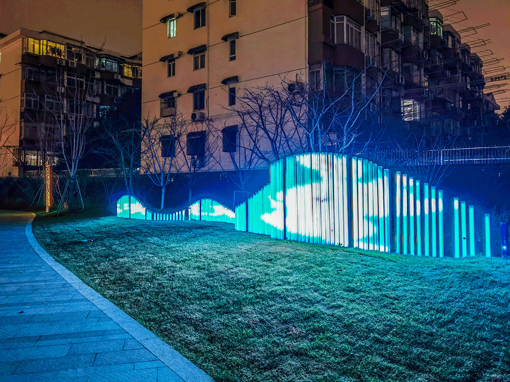虹口区嘉兴街道畅心园是整个嘉兴街道灯光项目的设计重点,以线光来勾勒景观环境的主要结构,用面光来烘托部分树木和景墙,使整体景观在夜晚也能表达出如白天一般的环境语言。