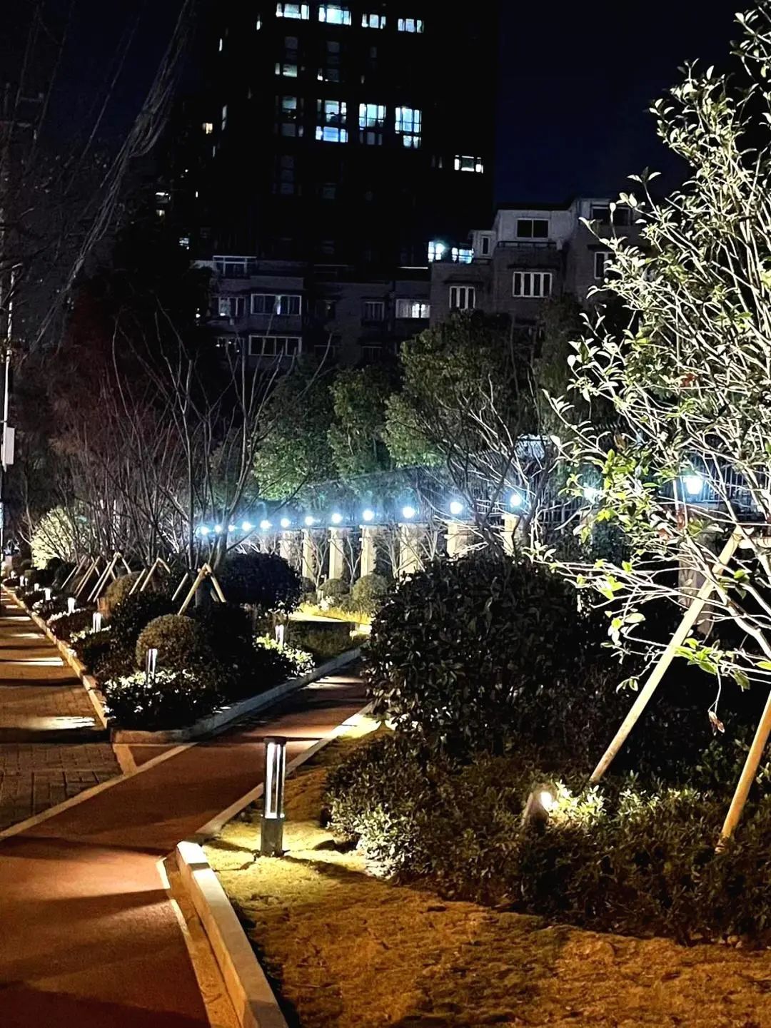 街区内沿着蜿蜒的漫步道,分布了明亮的绿地灯光,宛若指引都市夜归人返家的使者,细心地照亮着人们脚下的每一米道路,灯光柔而不隐,雅而不争,恰到好处地与绿地里的植物相辅相成,让夜晚的植物们更加灵动起来。