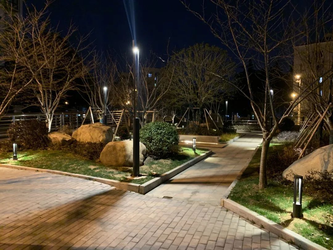 每个黄昏褪尽的夜晚,韩谊路的灯光便自然地融入到了景观之中。淡淡的灯光轻柔地洒在了走道上,应和着天空中微弱的月光,不仅赋满诗意,也给住宅区的居民提供了安静温和的游园环境。
