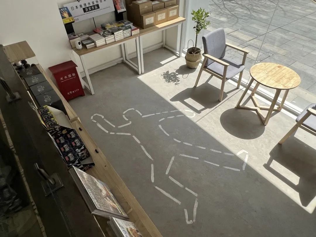 孤岛书店就在这样的“玩笑”中诞生了,而时晨如今开起来的谜芸馆,也离不开朋友们的帮助。店里一楼的地上,用白笔勾勒出一条尸痕固定线做装饰,是他请一位朋友躺在地上,摆好姿势,自己再亲自描边画出来的;正在贩卖的文创帆布袋,是他的一位朋友设计并参与制作的;店里若是开展什么读书活动,他的作家朋友们也势必来助阵……