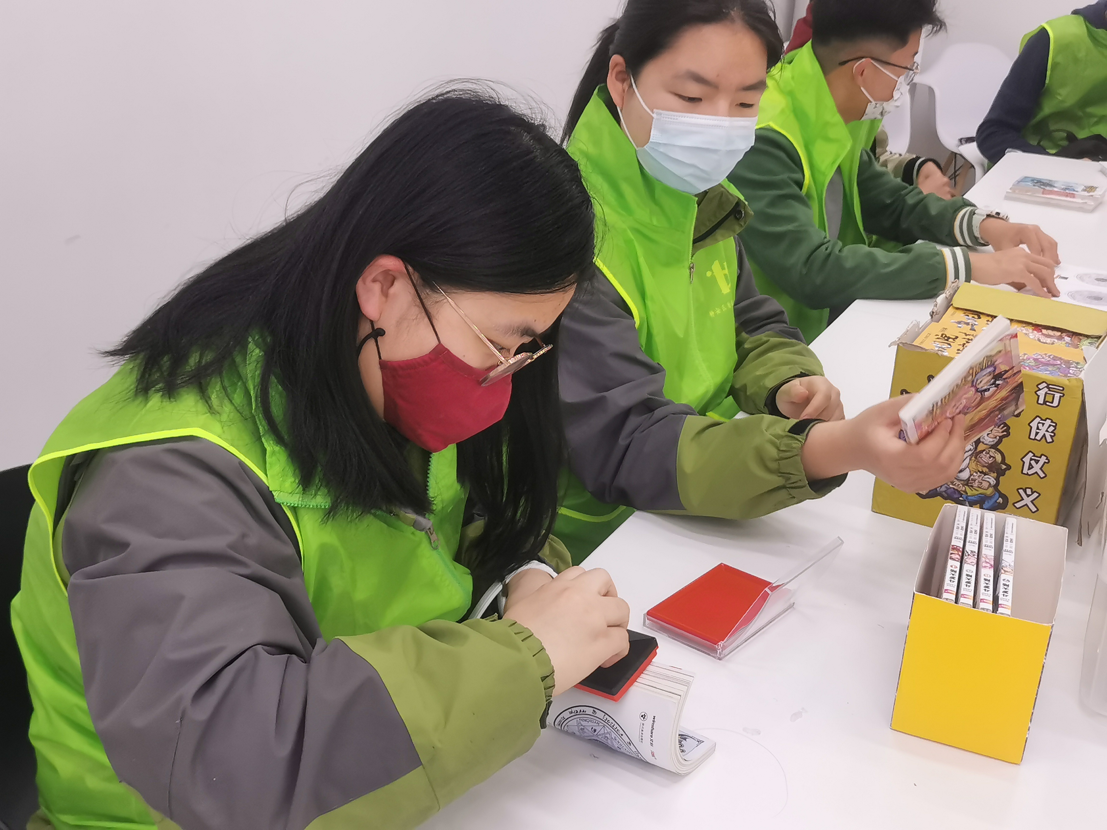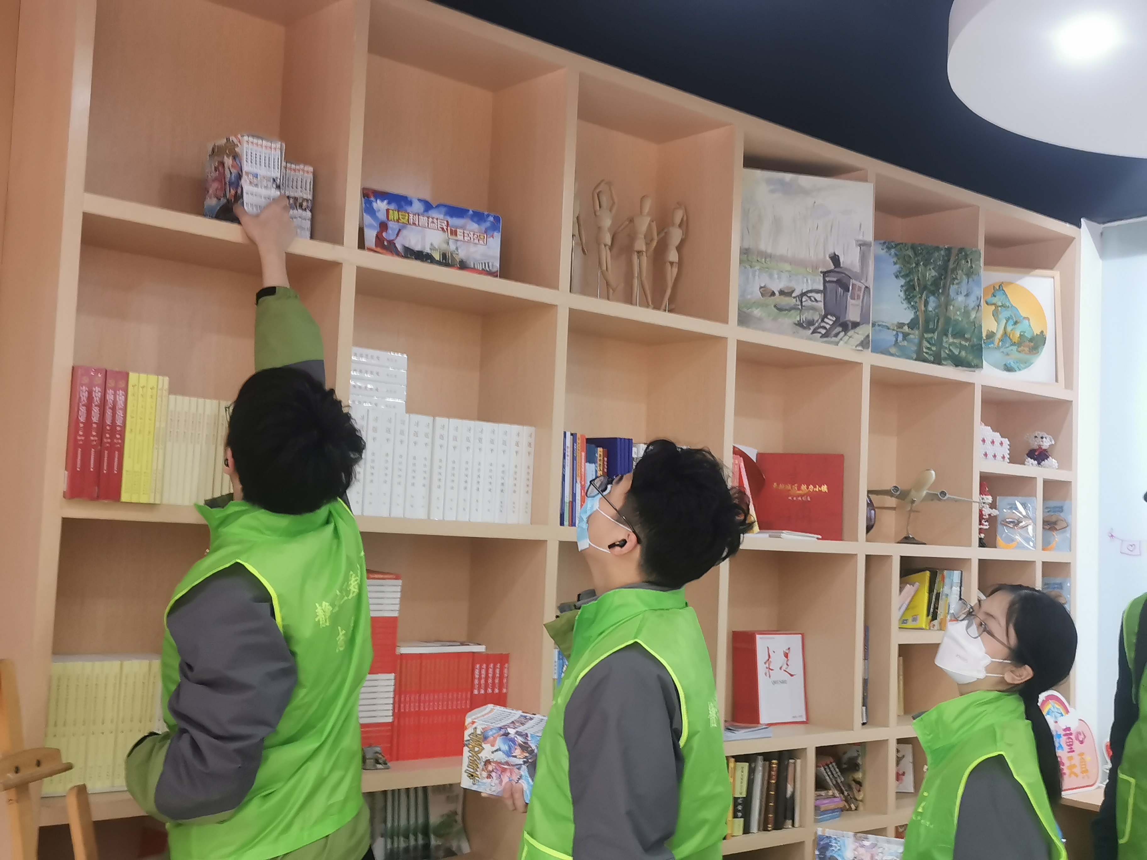 来自上海市育才中学的志愿者们将各种图书按照不同类别进行分类、编号、盖章,并将图书排列整齐。图书们都回到了自己的“家”,为读者借阅提供了方便。