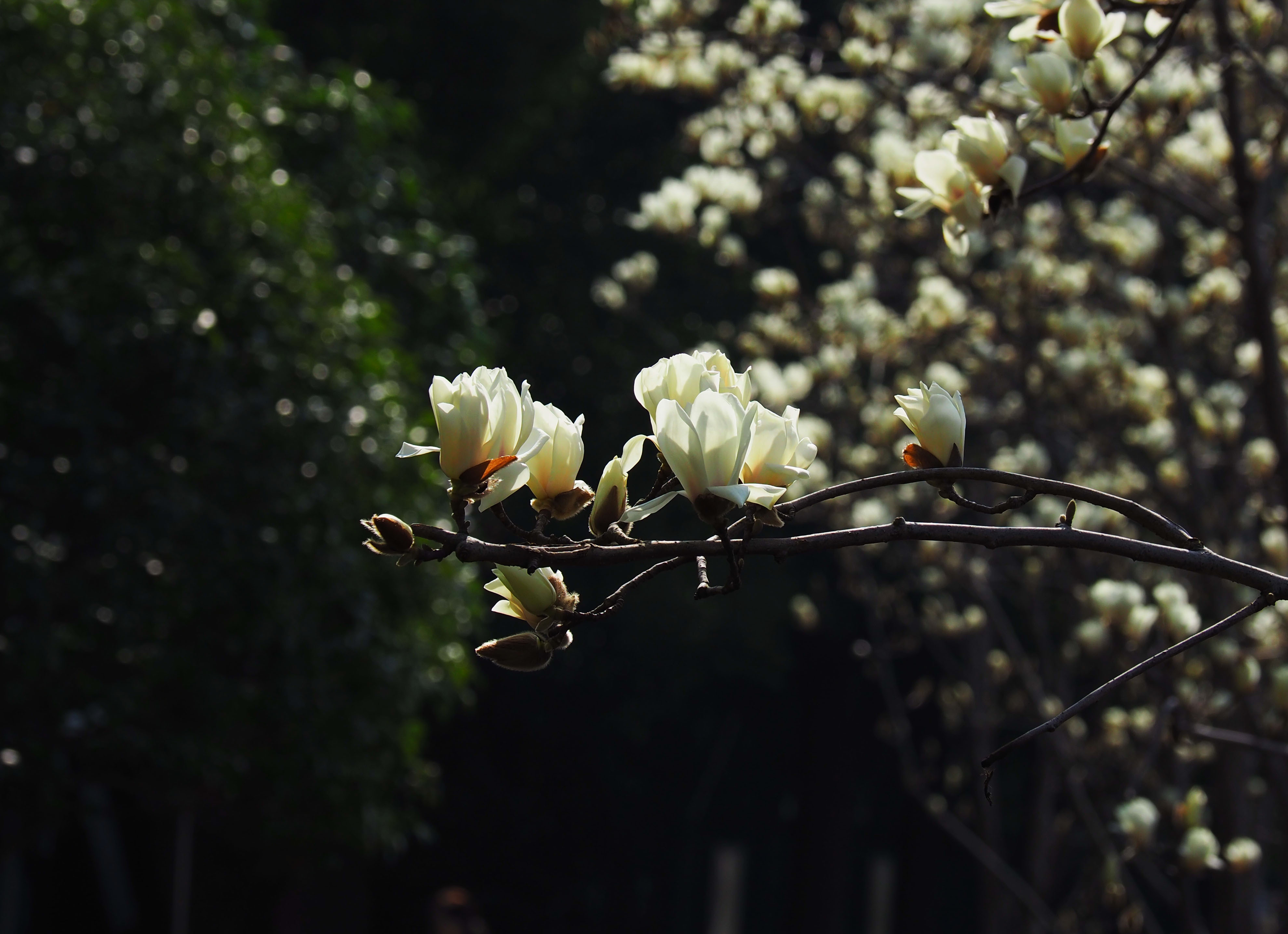 洁白的玉兰花在阳光下,或是独立于枝头,或是在曲枝上开出优美的花姿。有的花朵花瓣片片张开,洁白如雪。有的则害羞地半开半闭,花瓣上透出些许嫩黄。走在花下,行人不住地抬头欣赏这如云如雪的美景,殊不知自己也成了花路上的风景。