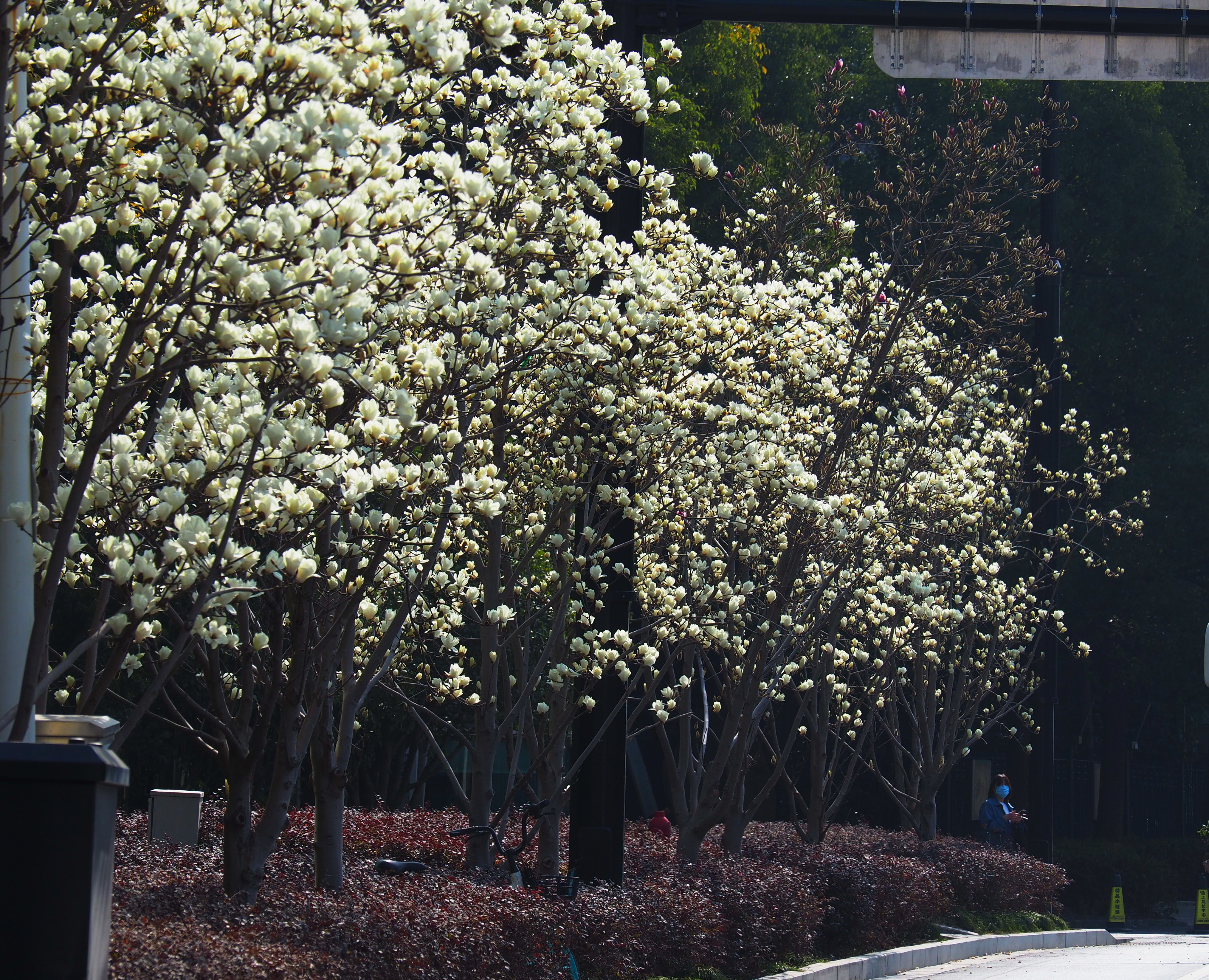 而紫玉兰与白玉兰交错栽种,也让这条玉兰花道灵动起来。“这一排的花很有特色的,这边是白的,往后面是红的。晴朗的蓝天,衬着白色的花,就是给人很舒服的感觉。”市民王女士推着孩子徜徉在蜿蜒的花路上,时不时地拍照打卡,“感觉心情都不一样,就是那种春天来了,疫情也过去了,什么都可以释放出来的那种感觉。”