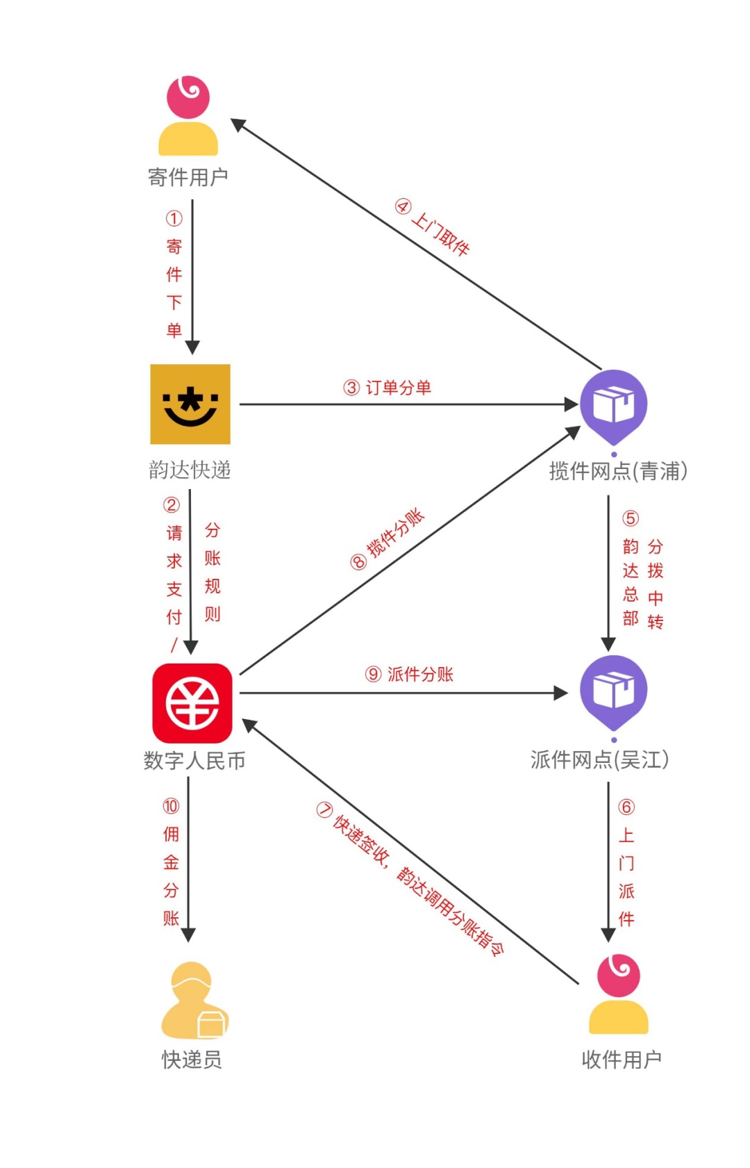 依托示范区快递行业总部企业集聚优势,基于企业自身发展需求,示范区执委会携手中国银行上海市分行积极对接快递企业,围绕企业现有支付模式三大痛点,结合数字人民币特性,通过智能合约技术,优化改造快递企业APP系统,实现了揽派件网点和快递员收入的实时分账: