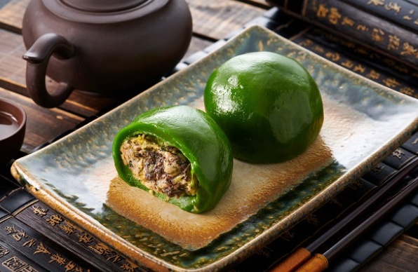 鲍鱼陈皮猪肉融合了不少特别的食材,广东新会的十年老陈皮,黑松露,还有整只海鲜大连鲍。黑松露青团,是将新鲜的黑松露自制成黑松露酱,然后再与荠菜肉馅混合均匀,这样既保留了荠菜肉青团的口感,又增加了黑松露的浓郁香气。