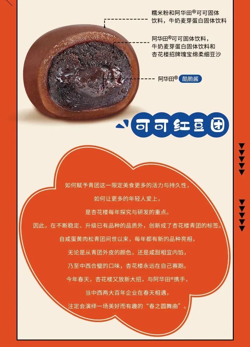 可可红豆团团子外皮加入了阿华田著名的可可固体饮料,搭配杏花楼招牌魂宝绵柔细豆沙,包裹阿华田酷脆酱做的内馅,淡淡的可可香,清香的豆沙及巧克力的甜醇形成的组合,极富趣味的口感,突破性极强。
