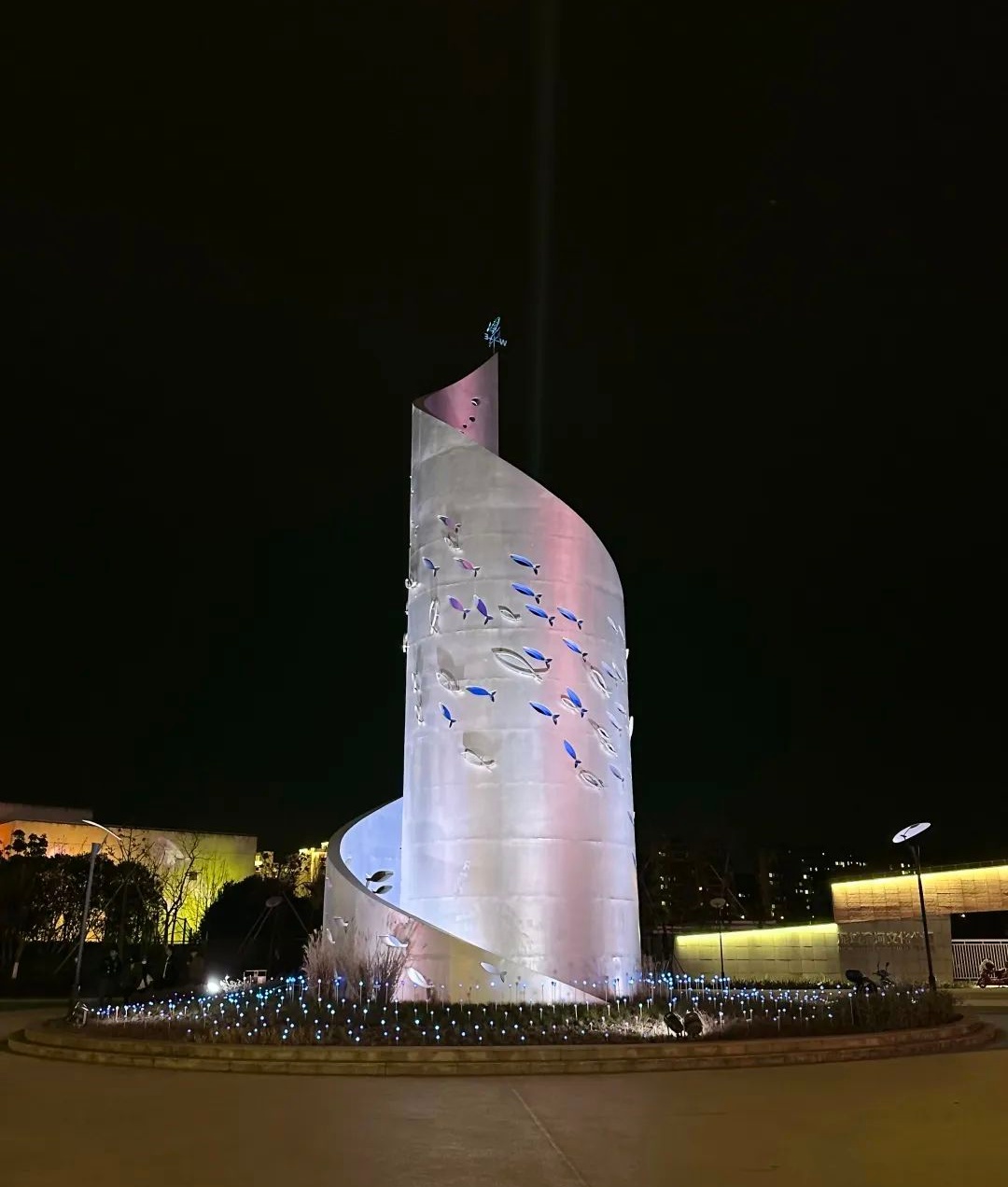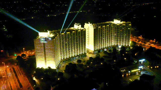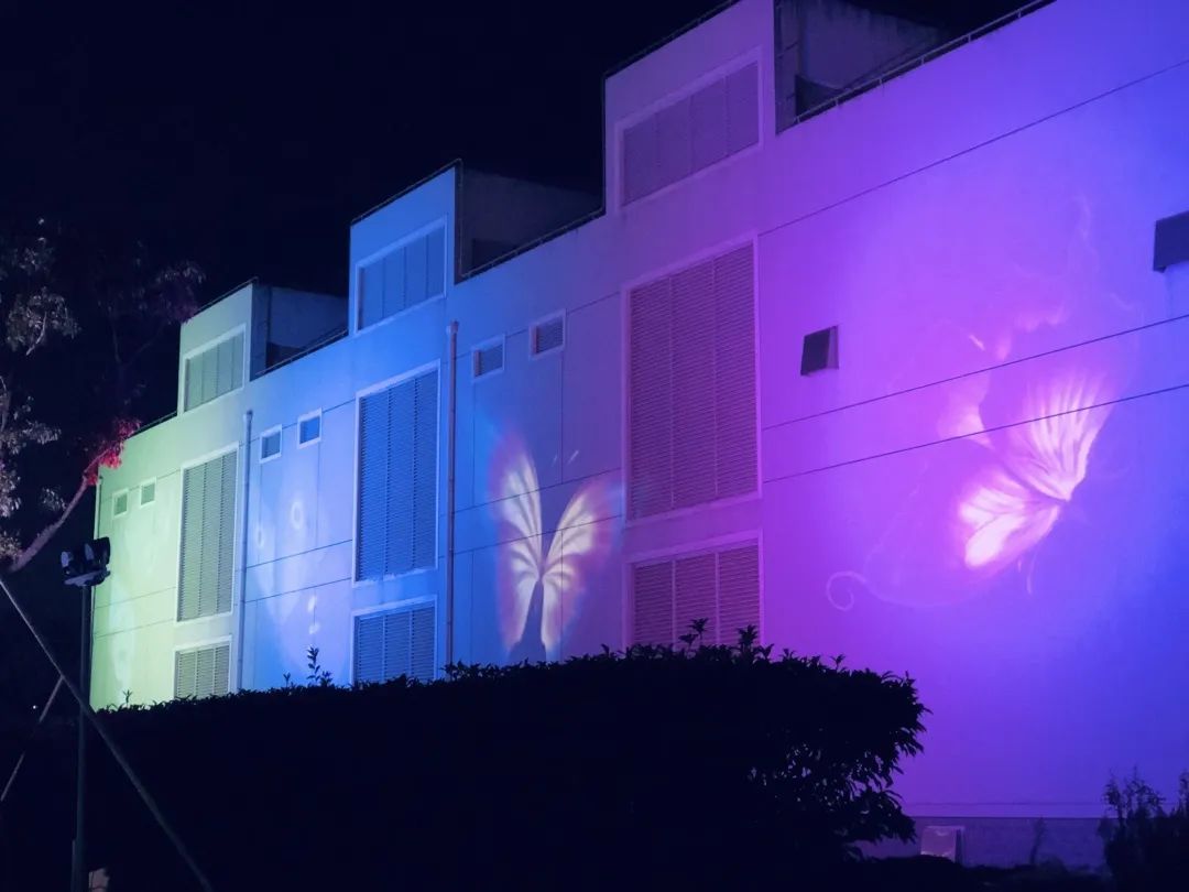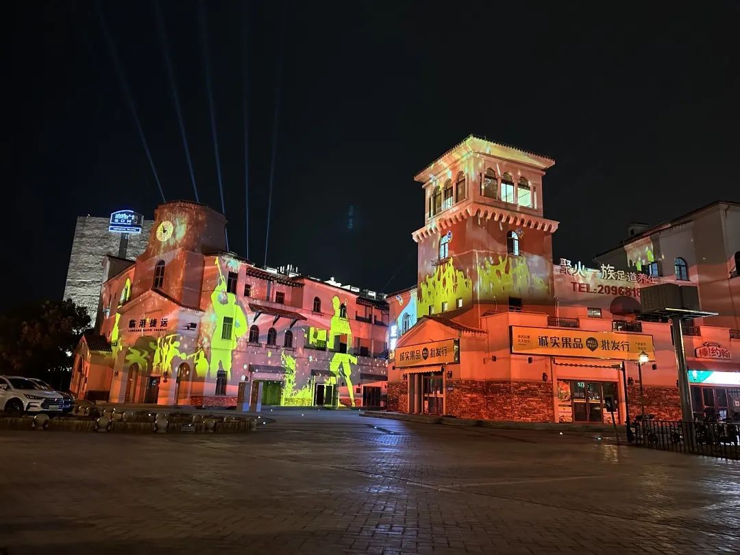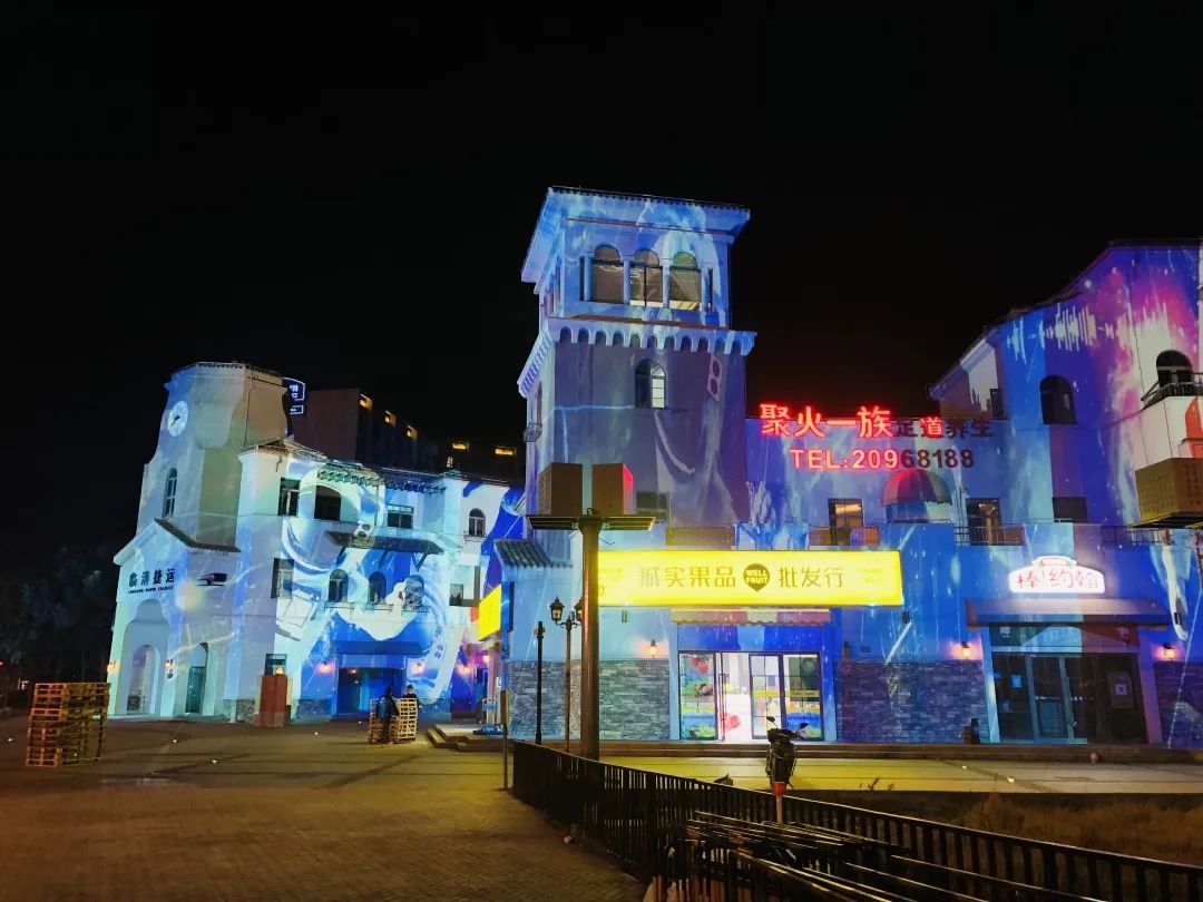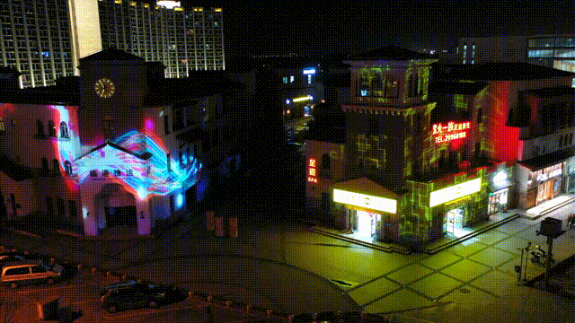 鸿音广场,整条鸿音路灯光工程的起点。以建筑为投影载体,用“光影秀”的形式展示“临港文化”、“红色泥城”,充分展现夜色泥城“第一印象”。