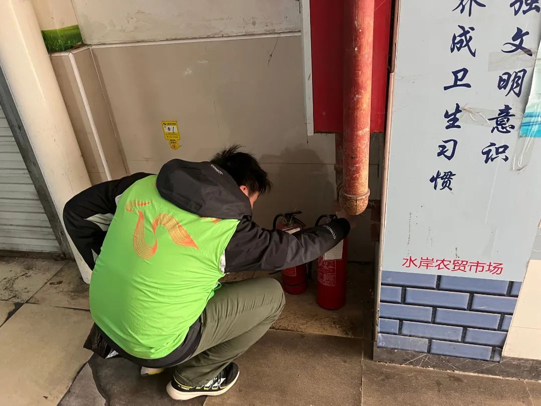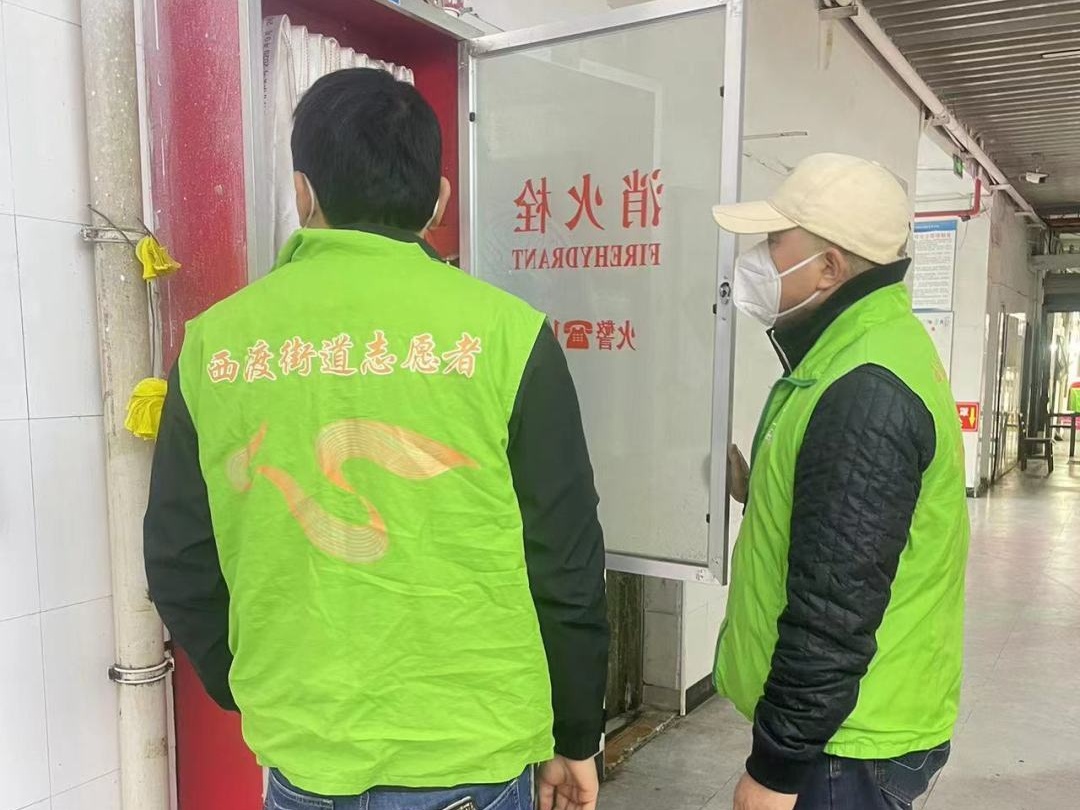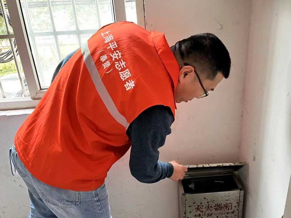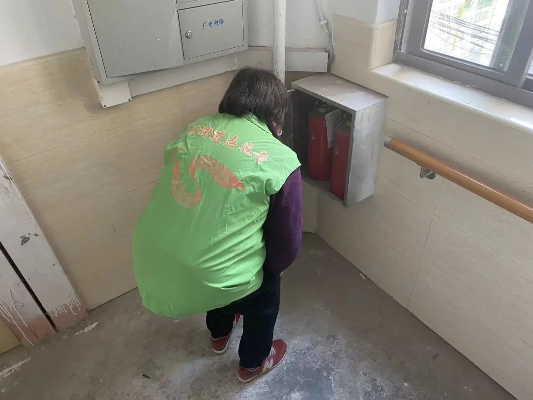 对楼道配电箱、消火栓等设备进行安全检查。同时,志愿者们向周边居民、商家店铺宣传普及市容市貌治理、城市绿化保护等相关知识。