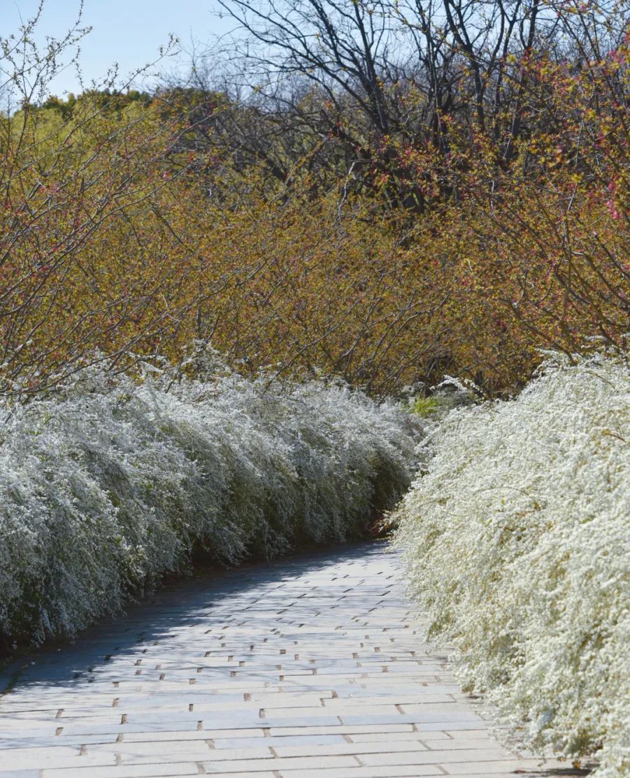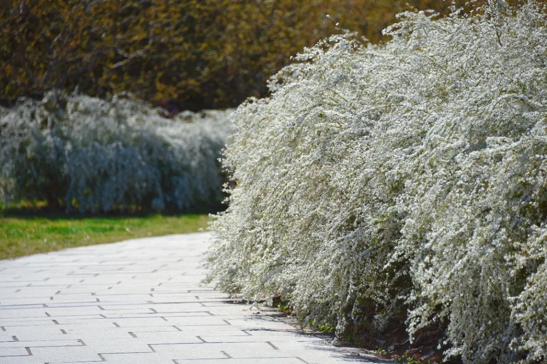 你就能看到繁茂的白花覆在园路两侧