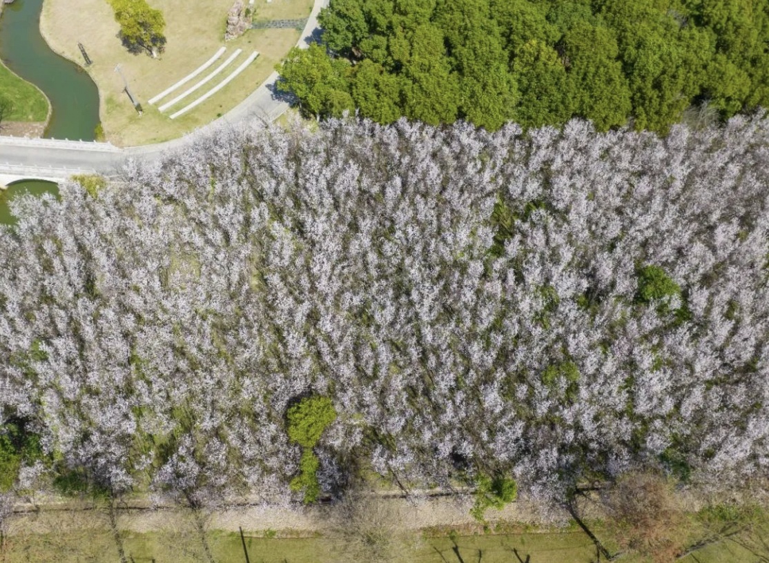 一旁的玉兰花和梅花也毫不示弱地绽放着,美丽的花朵密密麻麻地挤满了枝头,为整片树林增添了不少优雅与艳丽。