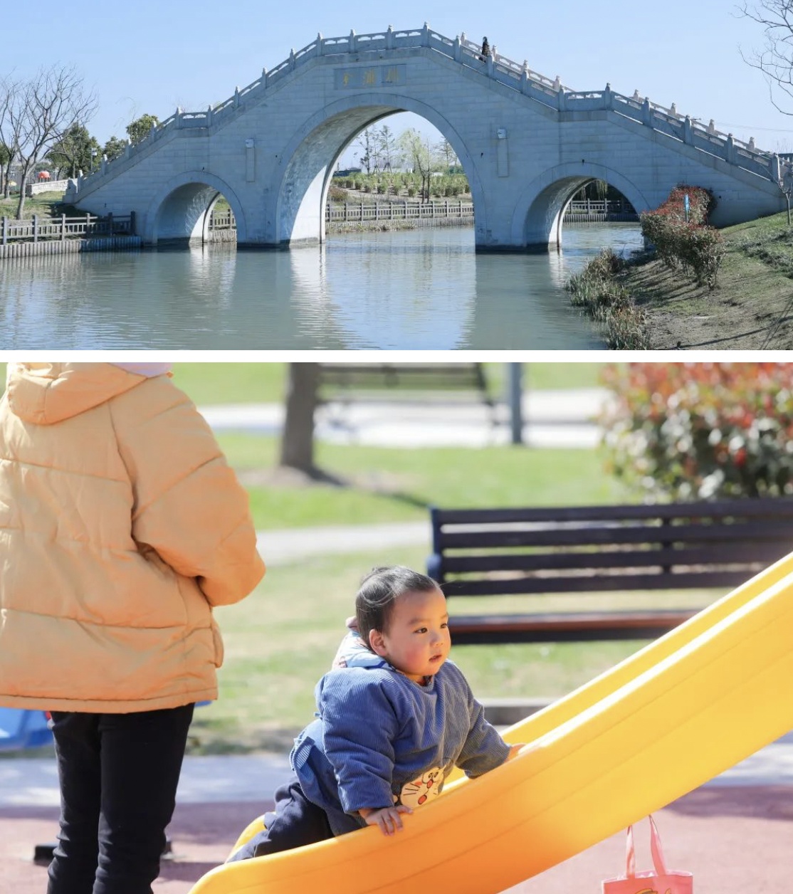 平整的草地,蔚蓝的天空,阳光照射下波光粼粼的湖面,孩子们的嬉闹声……站在金汇桥眺望这春景,真是好不惬意!