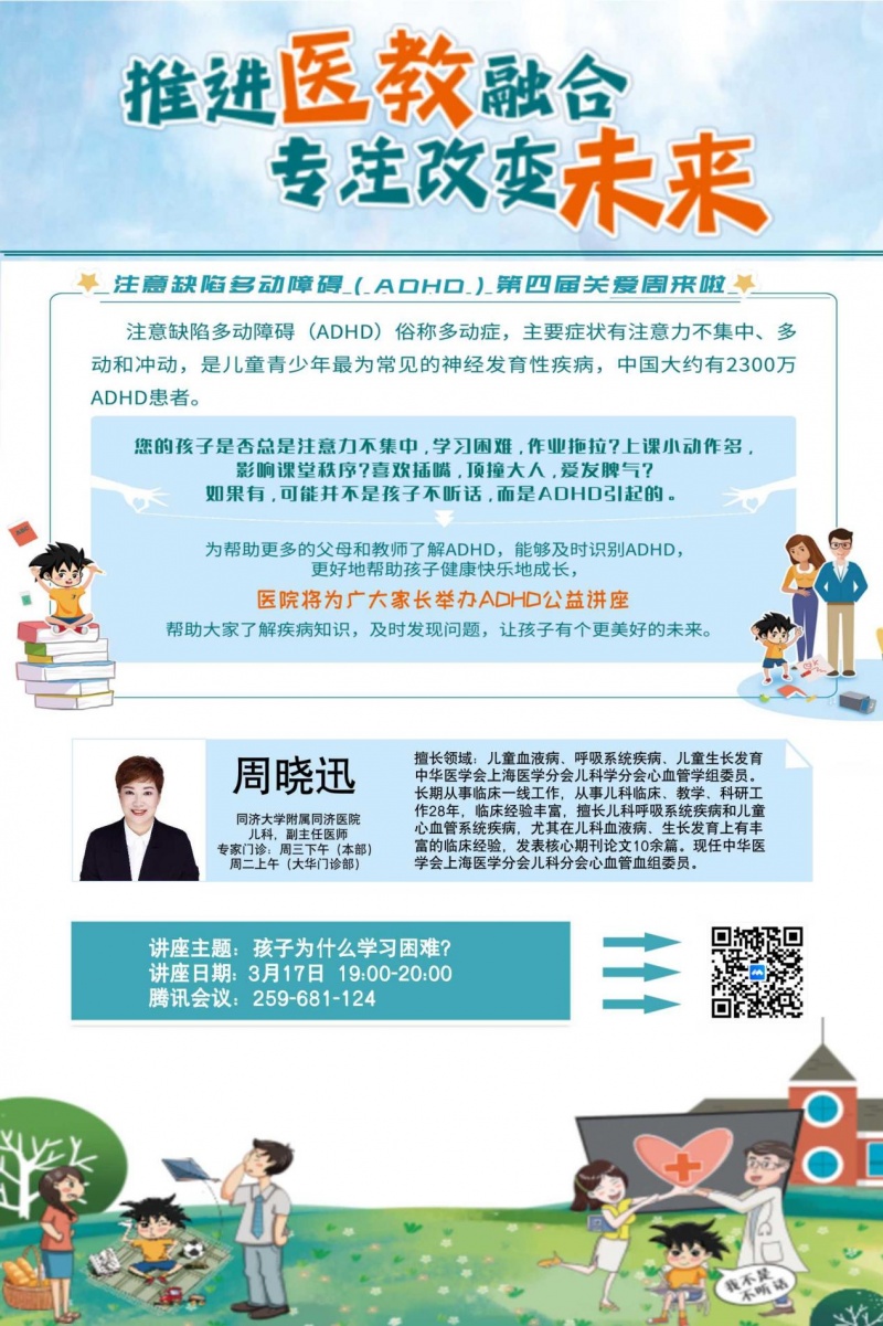 为全面提高大众对ADHD患儿的关注与认知,同济大学附属同济医院儿科将于3月17日(本周五)开展线上科普讲座,帮助更多家长学会识别ADHD,从如何改善孩子的学习困难问题入手,学习ADHD管理策略,从而促进孩子健康成长。