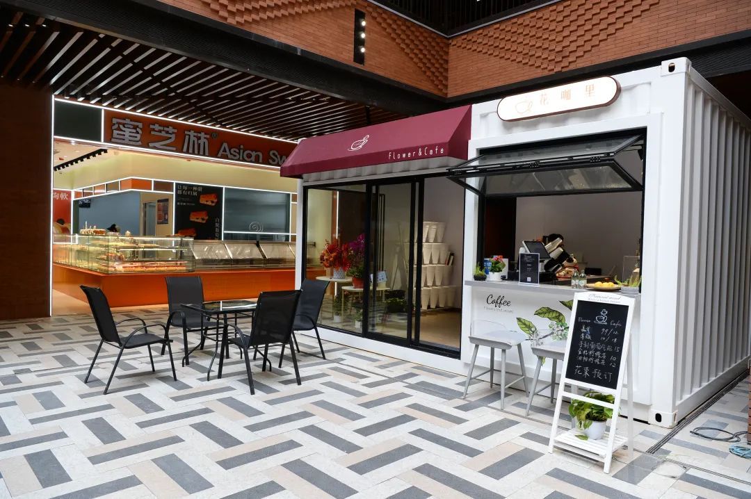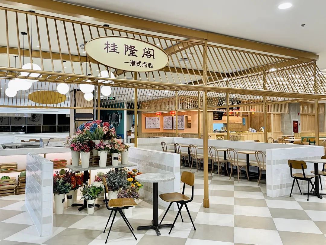 有复古报刊亭设计的瑞幸咖啡、鲜花和咖啡的浪漫组合花咖里、桂桂茶、主打元气椰子水的椰小小、冰淇淋中国茶品牌须尽欢,还有炒货尖锐欢囍花生、花式糖葫芦喜六月、裕兴旺老上海特色里脊肉等特色小食品牌。