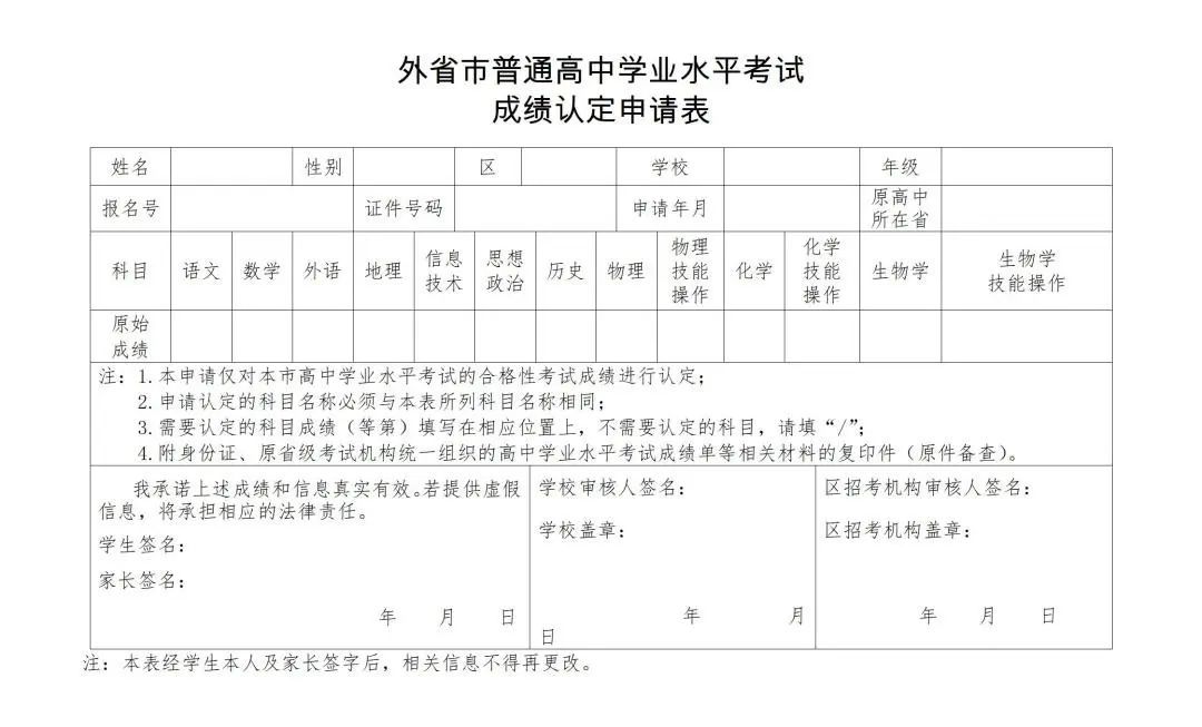 未转学进入本市普通高中就读的其他考生如需申请外省市成绩认定,可参照外省市成绩认定管理办法执行。考生持省级考试机构统一组织的高中学业水平考试成绩单等相关材料原件和复印件、身份证原件和复印件于3月21日至3月23日(9:00—11:00,13:00—16:00)到报名地所在的区招考机构提交申请,填写《外省市普通高中学业水平考试成绩认定申请表》↓。区招考机构通过考试管理系统进行外省市成绩认定申报。