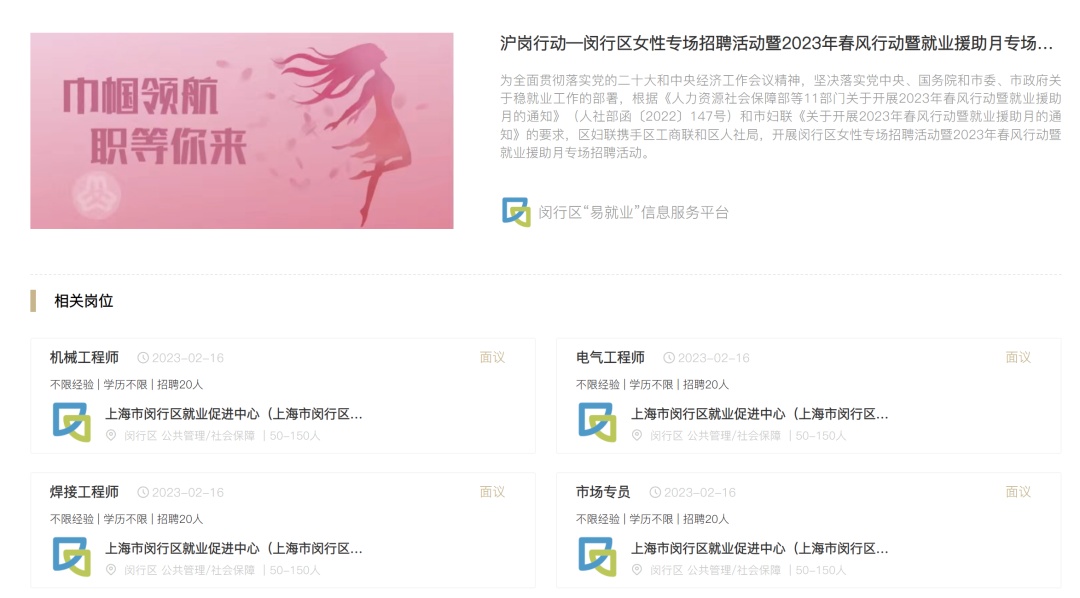据介绍,闵行区女性专场招聘活动暨2023年春风行动暨就业援助月专场招聘活动以线上+线下相结合的方式有序进行中,线下招聘在各辖区不定期开展,线上也将根据实际情况持续放出更多工作岗位。