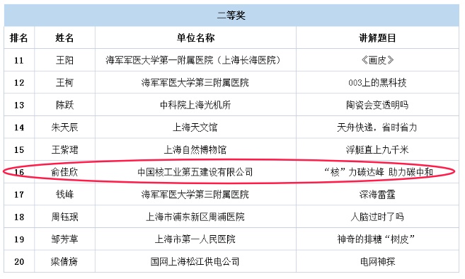 3月11日,第十届上海市科普讲解大赛总决赛在上海宝山智慧湾科创园举行,来自全市各个领域的40名选手同台竞技,共谱“科普最强音”。最终大赛决出一、二、三等奖及优秀奖各10名,其中,我区来自中国核工业第五建设有限公司的俞佳欣选手,以《“ 核 ”力碳达峰 助力碳中和》为讲解主题,荣获第十届上海市科普讲解大赛总决赛二等奖。