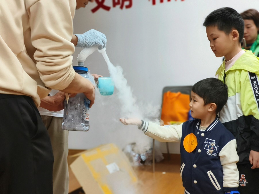活动开始前,老师将干冰准备好,并与前来参加活动的同学们介绍干冰的构成成分。记者了解到,为了保证整个活动的安全性,所使用的干冰均为食品级干冰。准备过程完成后,老师让同学们通过观察、触摸等方式,与干冰来了一次“亲密接触”。只见孩子们个个期待地伸出双手,迫不及待地想感受干冰带来的奇妙感觉。“原来爸爸妈妈带我出去吃饭的时候见过,今天是第一次摸到‘它’,有点冰凉的感觉!”有同学们开心地说。