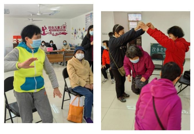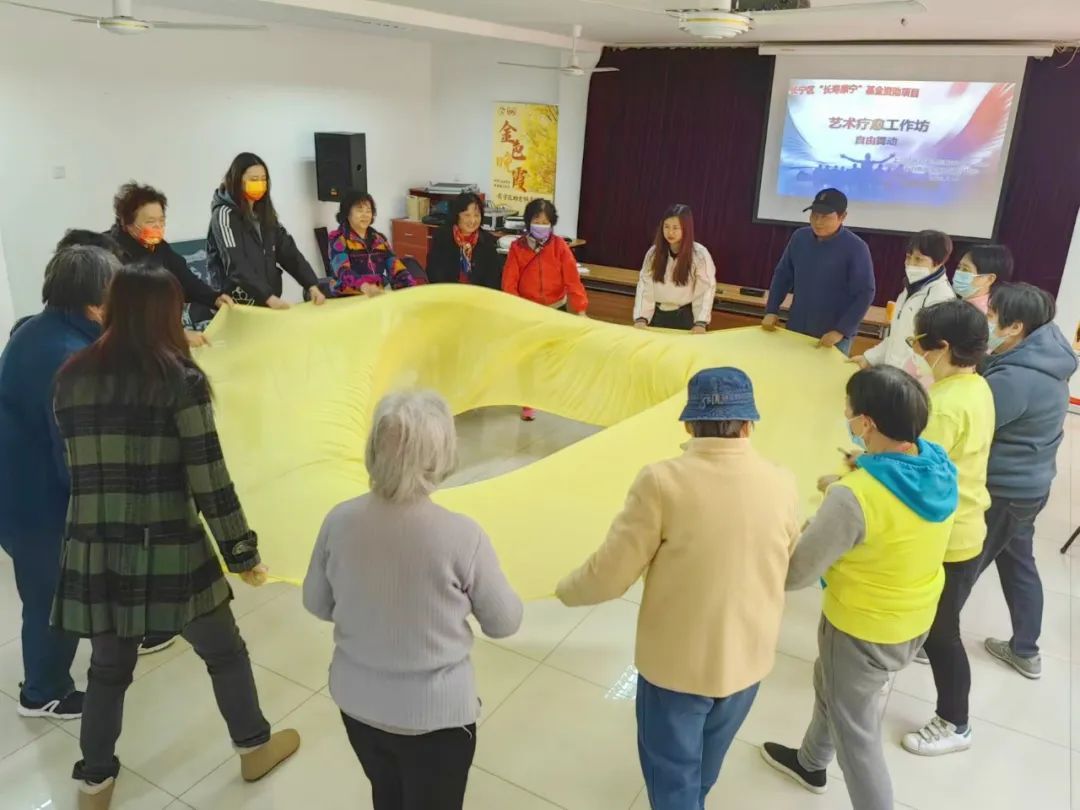 在指导老师鲍臻的带领下,老人们跟随节拍,通过暖身“拍拍操”和“东西南北中”的趣味游戏,敞开心扉、丢掉“包袱”全情投入到活动中。