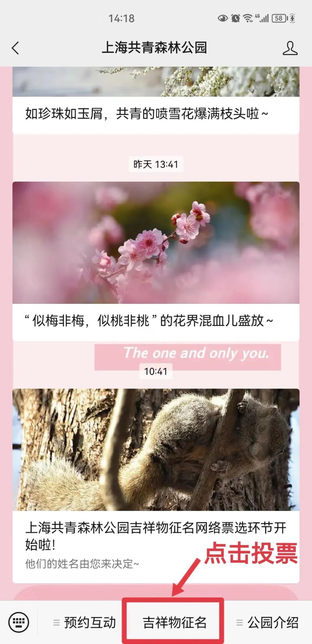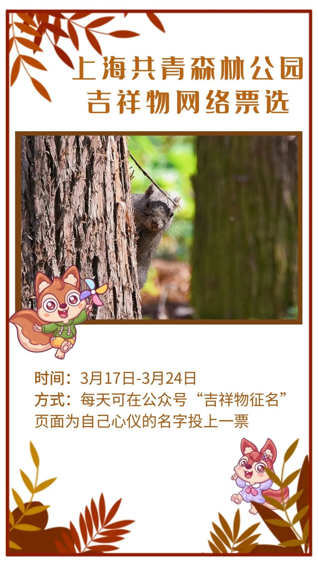 进入“上海共青森林公园”公众号点击菜单栏中间【吉祥物征名】进行投票