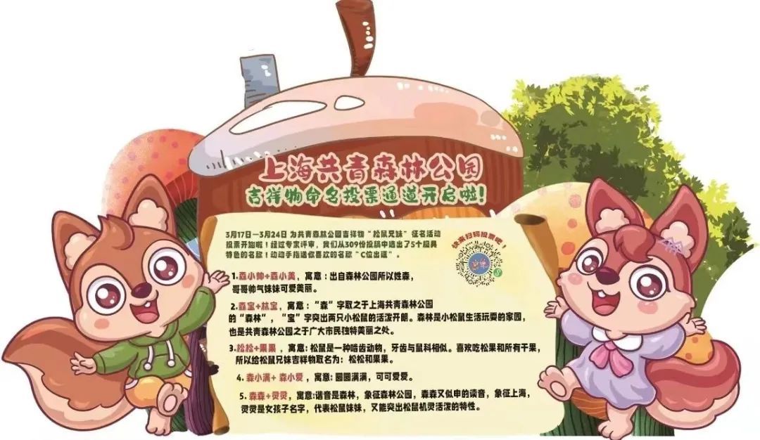 森宝和林宝:“森”“林”二字字取之于上海共青森林公园,“宝”字突出两只小松鼠的活泼开朗,森林是小松鼠生活玩耍的家园也是共青森林公园之于广大市民独特美丽之处。