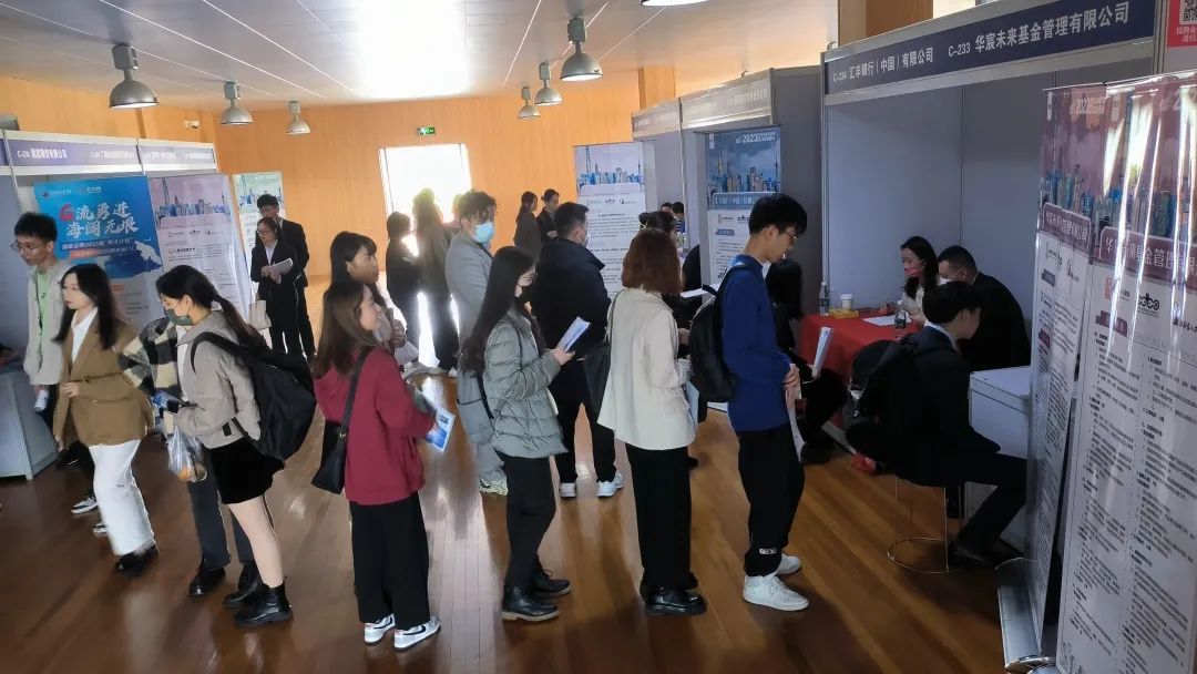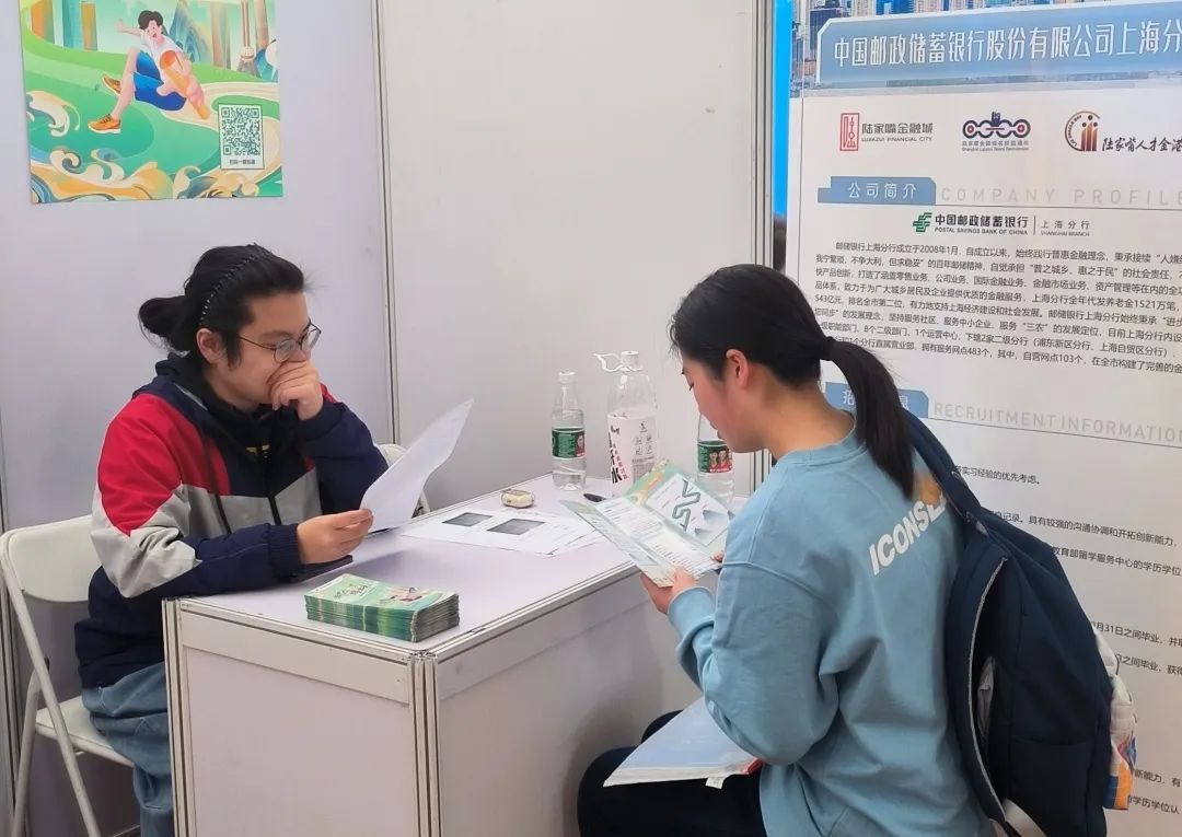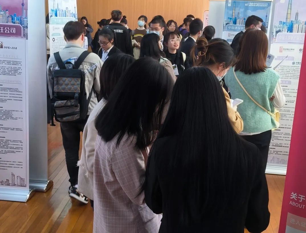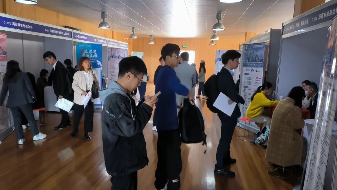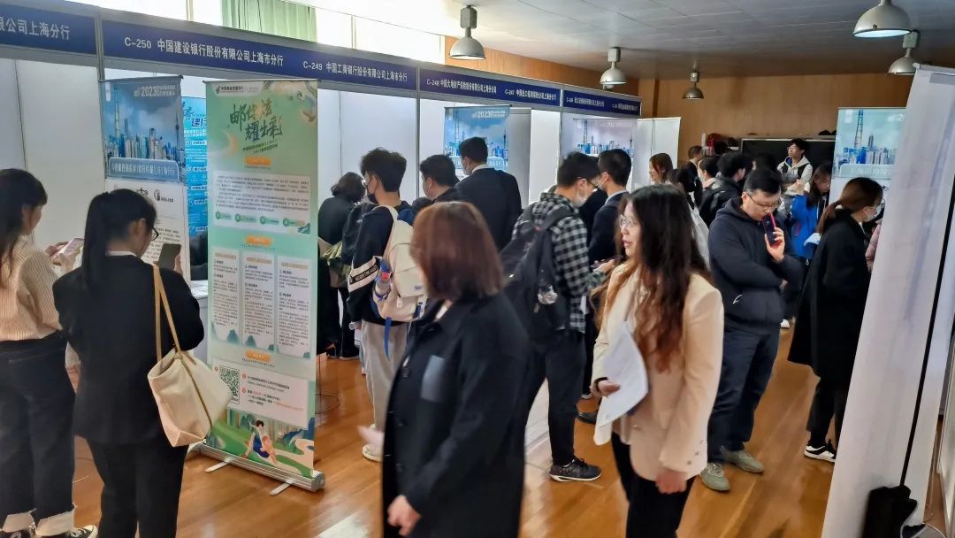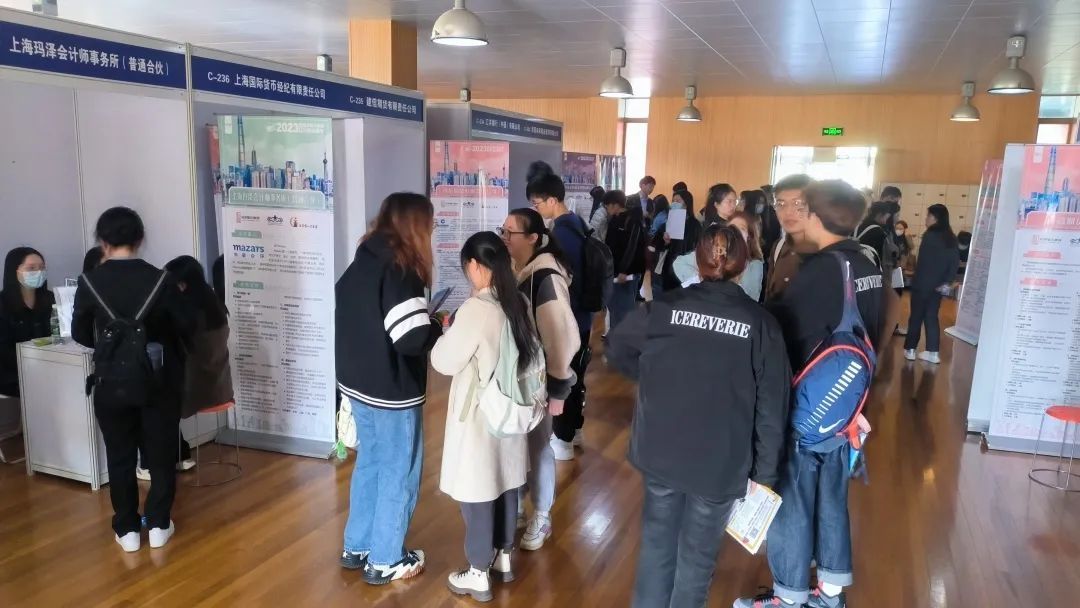 上海对外经贸大学招聘会现场吸引了不少学子的目光,现场人头攒动,学子们排着长队,纷纷聚集在岗位前热切地讨论着。