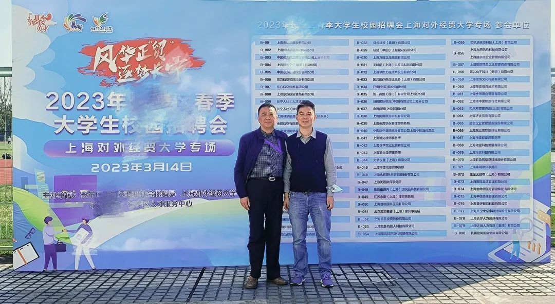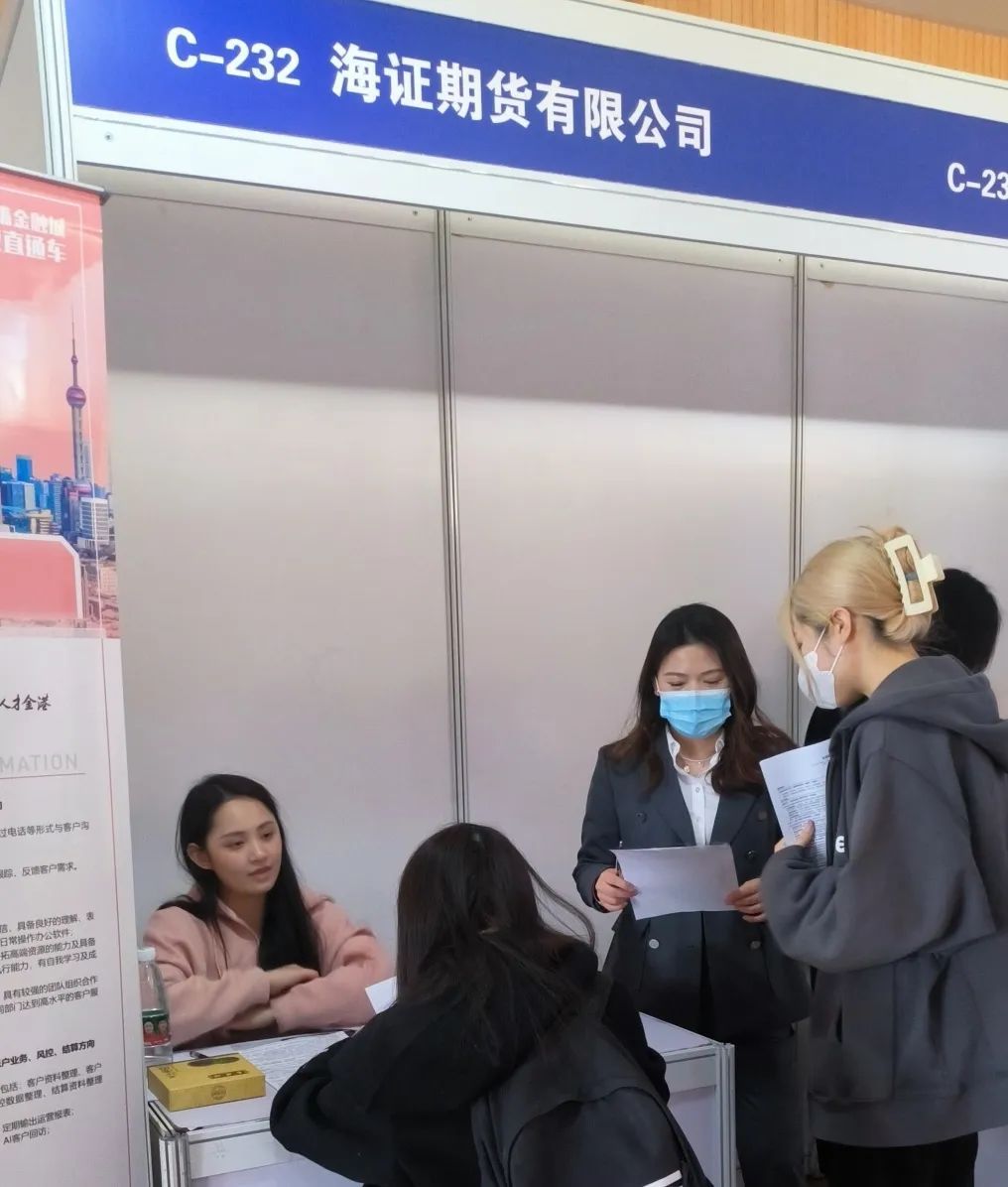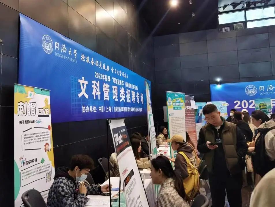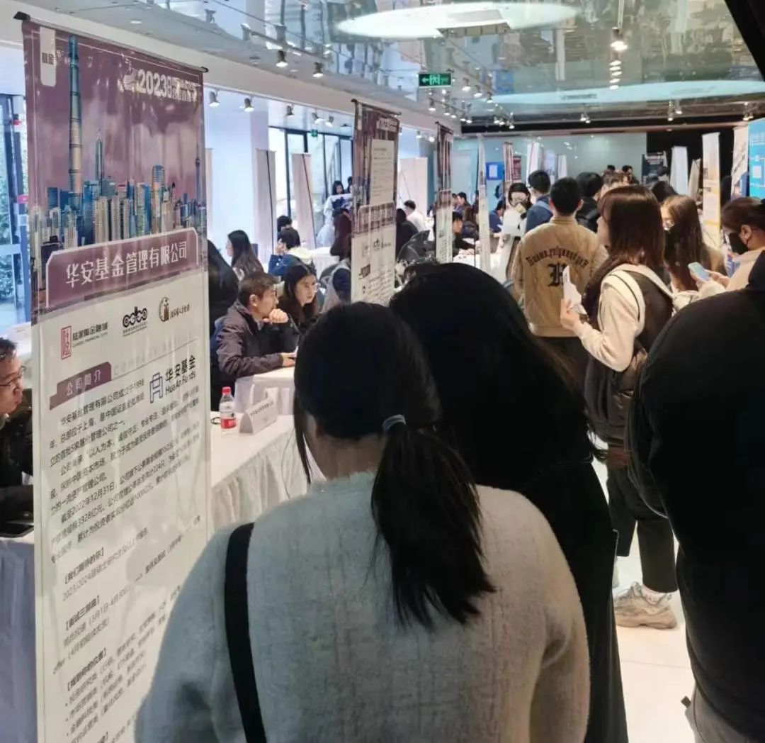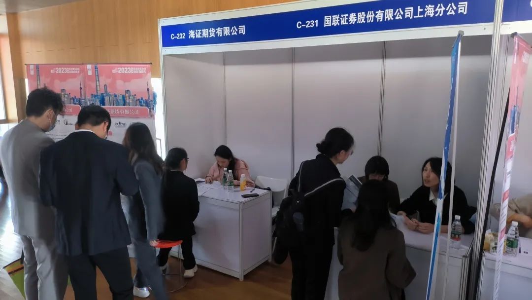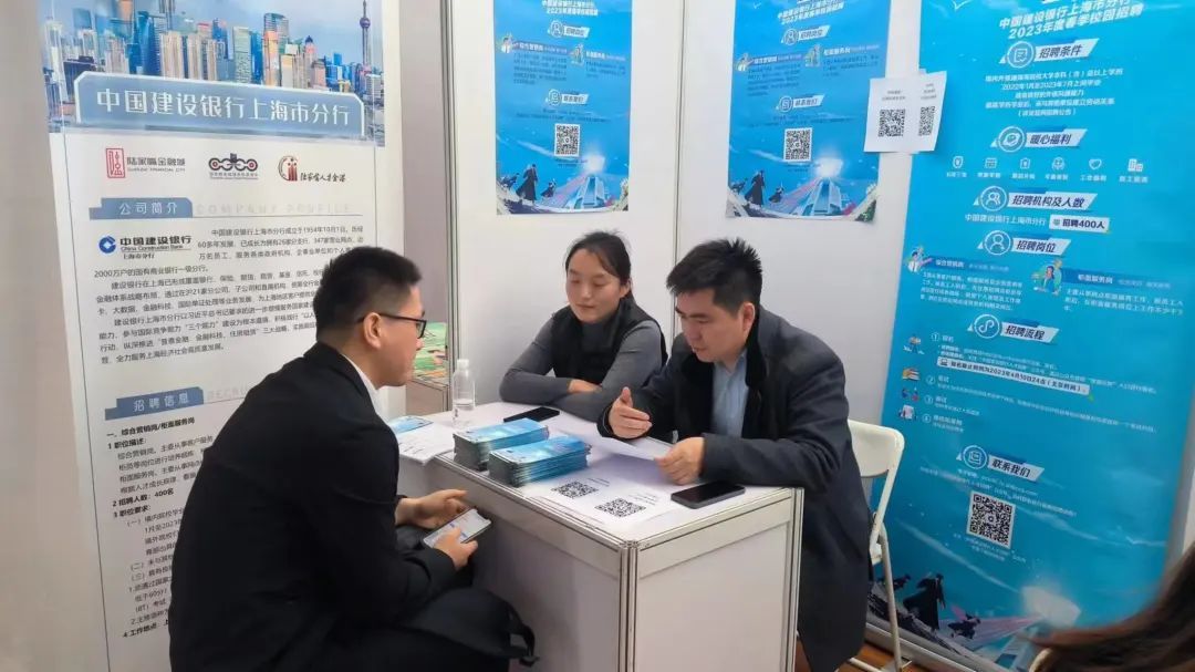 上海对外经贸大学招聘会现场吸引了不少学子的目光,现场人头攒动,学子们排着长队,纷纷聚集在岗位前热切地讨论着。