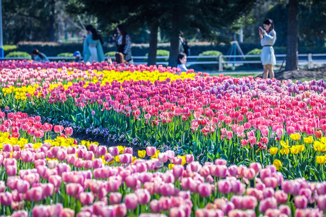 据了解,与往年相比,今年展示的郁金香多以混色种植为主,更显活泼。其中位于2号门绿色剧场附近的“辰山印象”花坛种植了粉色、红色、黄色等多个品种的郁金香,以流线型渲染童话般的梦幻氛围,引来众多游客留影。此外,矿坑花园附近的竹园花境也种植了大片郁金香。