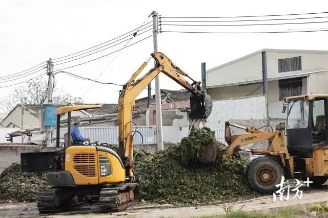 3天后,有工作人员操作挖掘机,将地上的芥菜搬运到铲车上,运至仓库中。
