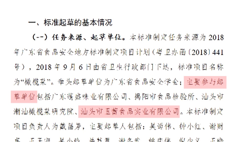 值得一提的是,2020年7月31日,广东省卫生健康委员会发布《广东省食品安全地方标准橄榄菜》(DBS 44 014-2019),其中明确要求原料芥菜应新鲜、无霉变腐烂现象,而玉蕾食品实业有限公司正是该标准的起草单位之一。