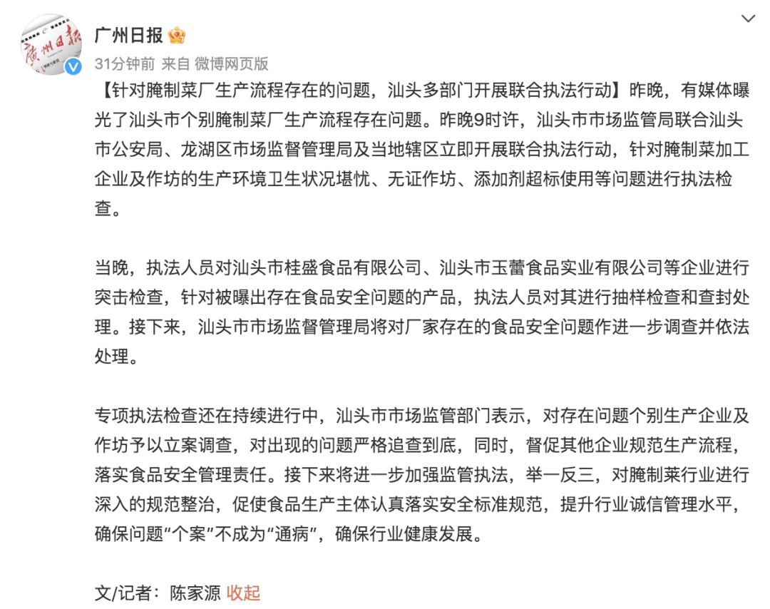 3月14日晚9时许,汕头市市场监管局联合汕头市公安局、龙湖区市场监督管理局及当地辖区立即开展联合执法行动,针对腌制菜加工企业及作坊的生产环境卫生状况堪忧、无证作坊、添加剂超标使用等问题进行执法检查。