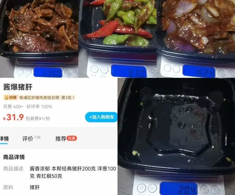 “超重”的有930私房菜(国和路店)的酱爆猪肝,标注“本帮经典猪肝200克,洋葱100克,青红椒50克”,经测量,猪肝235克、青红椒83克、洋葱162.4克,去掉保鲜盒重20.4克,三种食材依然全面“超重”所标的克数,足秤足量,洋葱超得还有些多。
