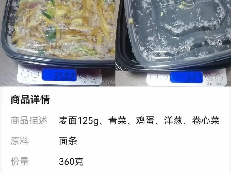 而丰收日(世界路店)炒面的炒面则“偏轻”:标注为共360g,但带盒仅350.2克,去掉33.7克保鲜盒重量,实际316.5克,比标注的要轻了43.5克,几乎接近“一两”。