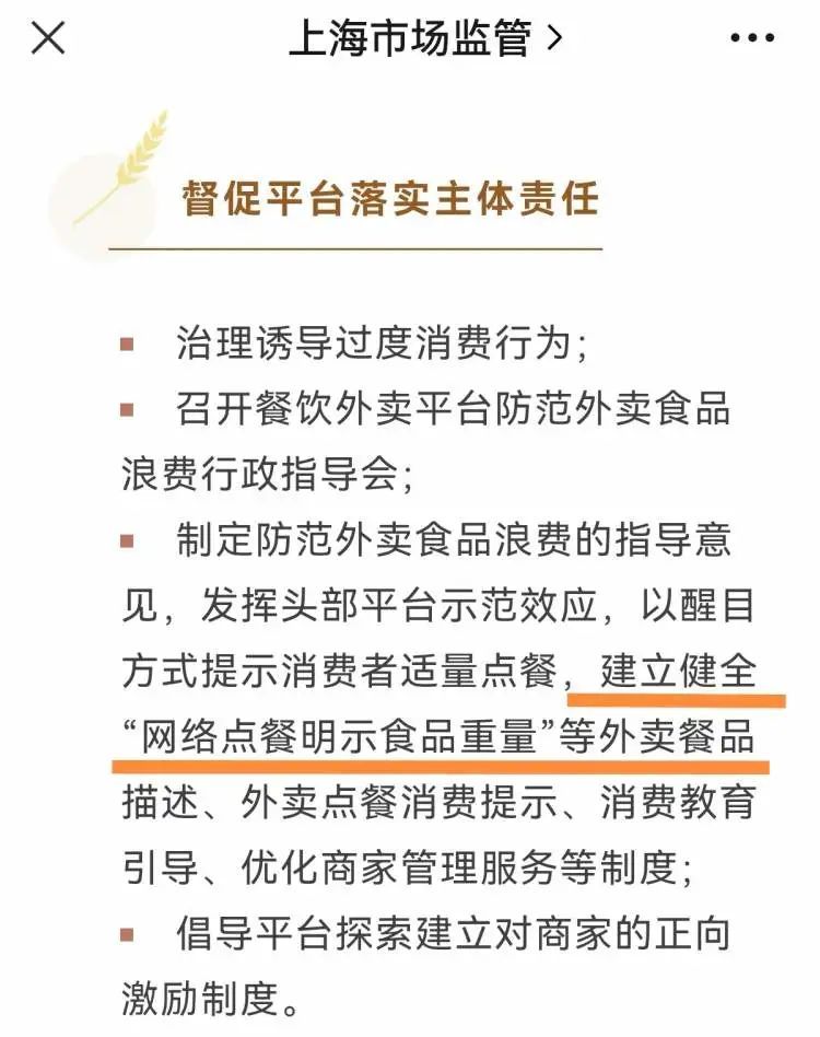 日前,上海市市场监督管理局召开制止餐饮浪费专项行动动员部署会议,在全市部署开展制止餐饮浪费专项行动。其中提到,建立健全“网络点餐明示食品重量”等外卖餐品描述、外卖点餐消费提示、消费教育引导、优化商家管理服务等制度。
