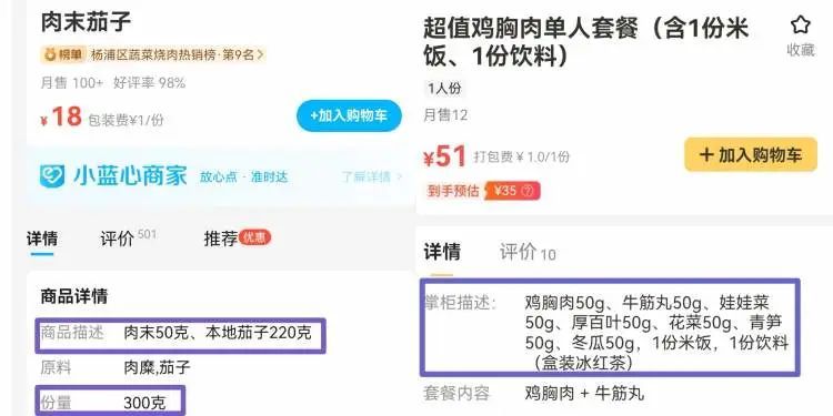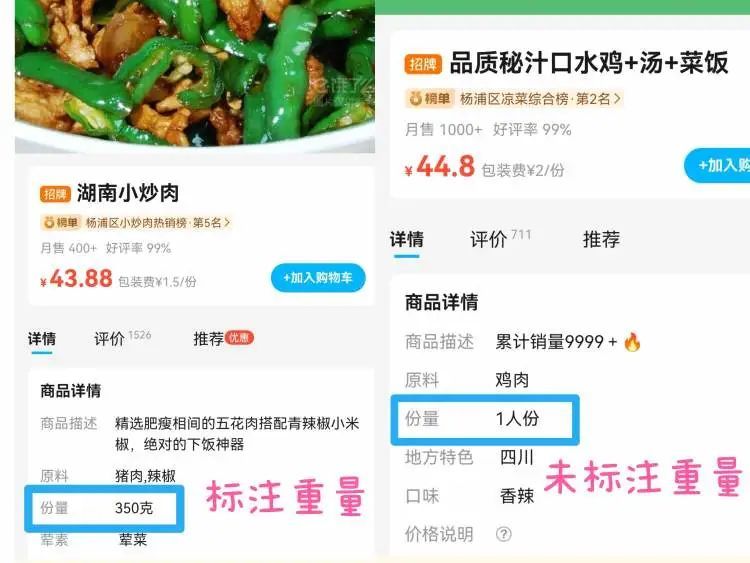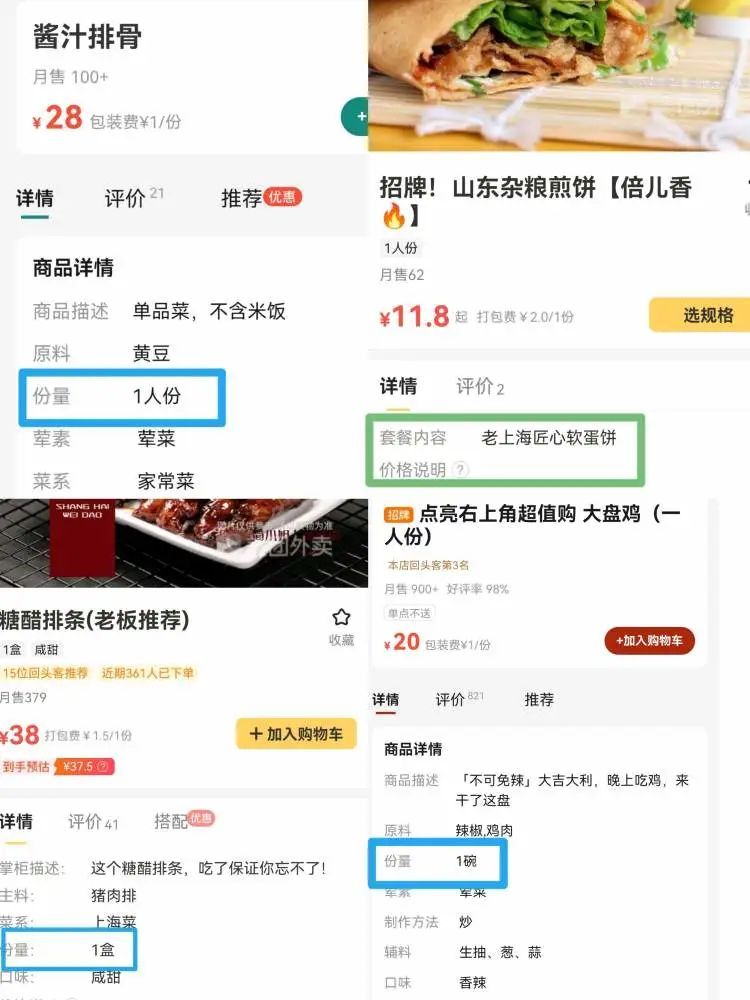 打开外卖平台APP的具体菜品页面,可以看到详情栏有“份量”一项,但是商户填写的情况不同。有的商户只填写“1人份”“1盒”“1碗”,有的商户填写总重“约1000克”,但有商户因为完全没有填写而使得“份量”一项并未显示在详情栏内。
