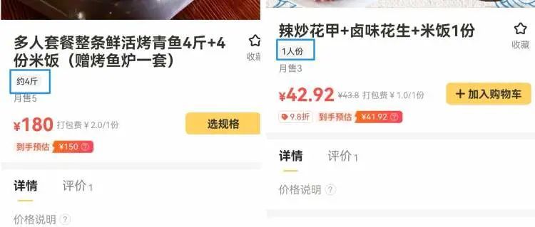 还有名为“烤鱼大咖小龙虾”的店铺,对多人套餐标注为“整条鲜活烤青鱼4斤+4份米饭”。不过,该店铺也有少数 菜品,比如“辣炒花甲+卤味花生+米饭1份”就没有标注重量了。