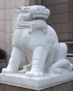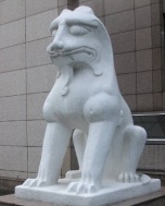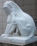 与此相对的仿南朝梁石蹲狮则表现了狮子的另一种样貌:它呈蹲坐状,狮发自然向后披,胸前挂有悬铃,左足抚小狮,小狮朝内依靠在母狮怀里,给人以安详、恬静的感觉。
