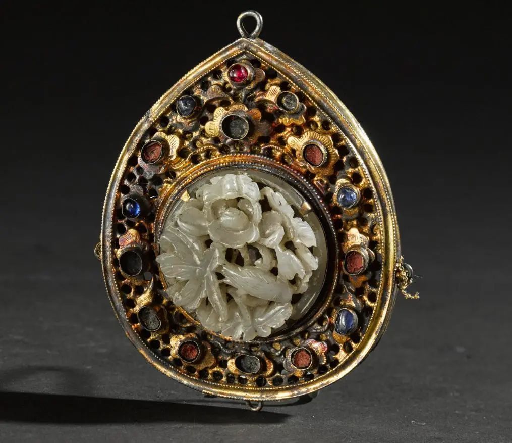 明 银鎏金嵌牡丹绶带纹玉饰霞帔坠