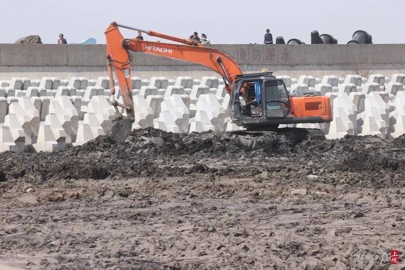 2023年3月15日,工程机械在海洋生态保护修复项目工地施工。