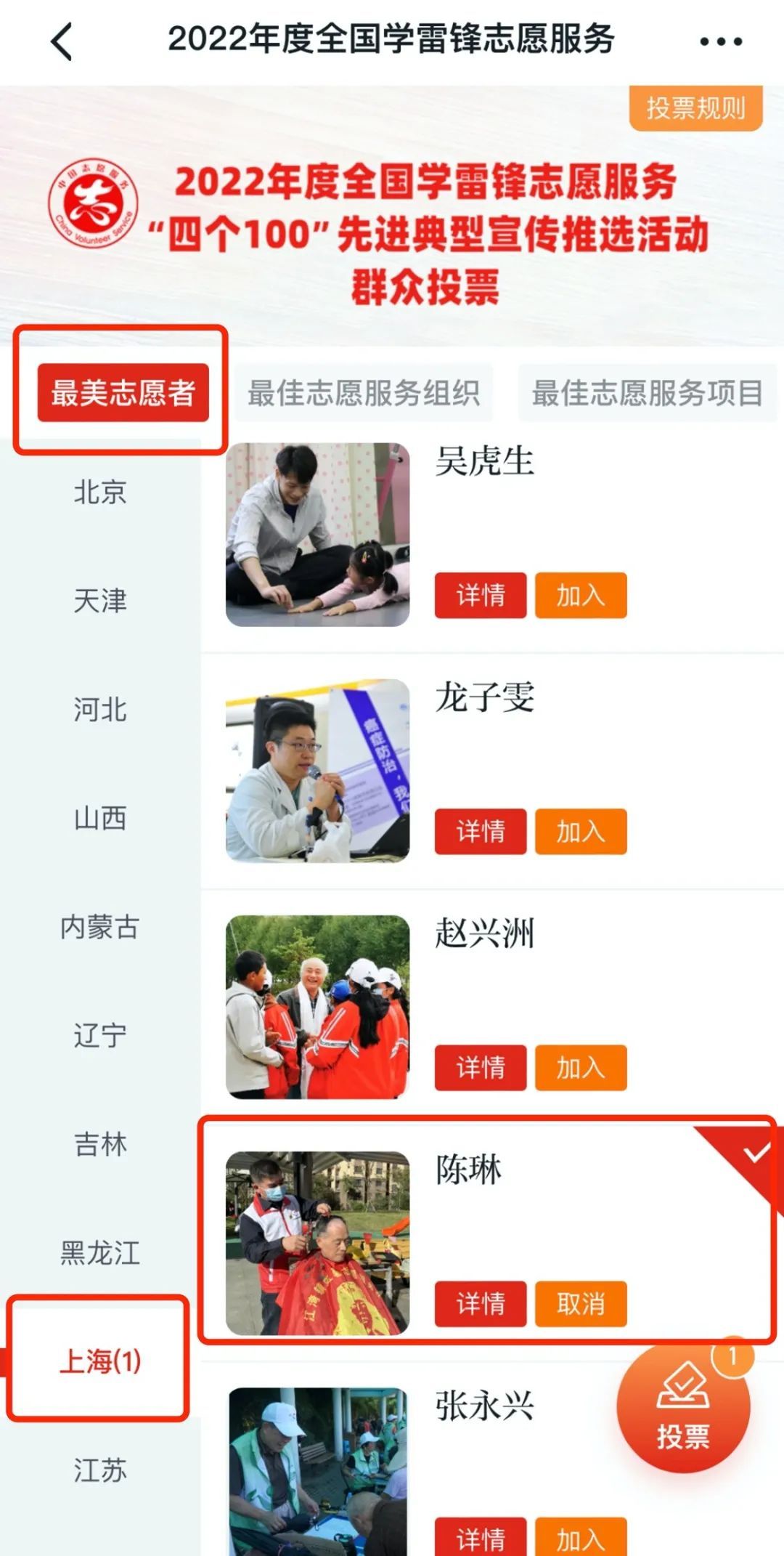在“最美志愿者”一栏,选择“上海”,找到“陈琳”的名字旁点击“加入”。