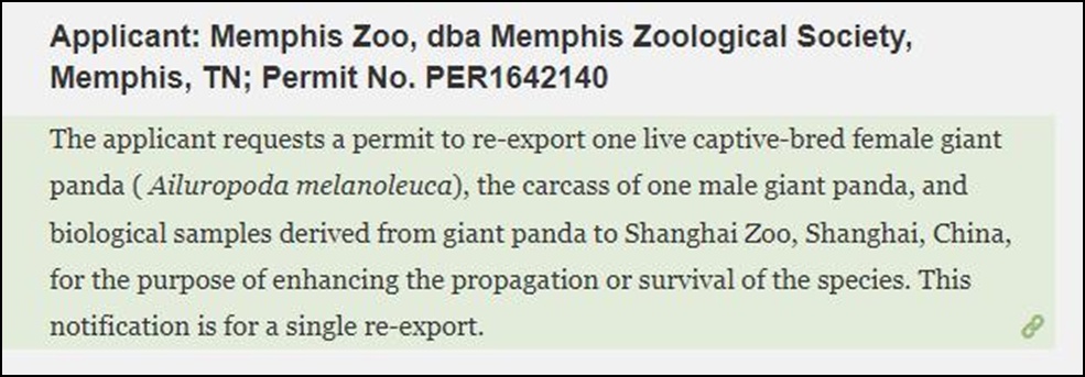 此前,美国鱼类及野生动物管理局(USFWS)已正式开始公示孟菲斯动物园大熊猫回国的相关证明材料。文件显示,“申请人申请将一只圈养繁殖的雌性大熊猫,一只雄性大熊猫的遗体,及大熊猫身体提取的生物样本转交到中国的动物园,以促进该物种的繁殖或生存。”公示期于3月13日正式开始,为期31天,截至4月12日。公示期结束后,USFWS将发放许可证。