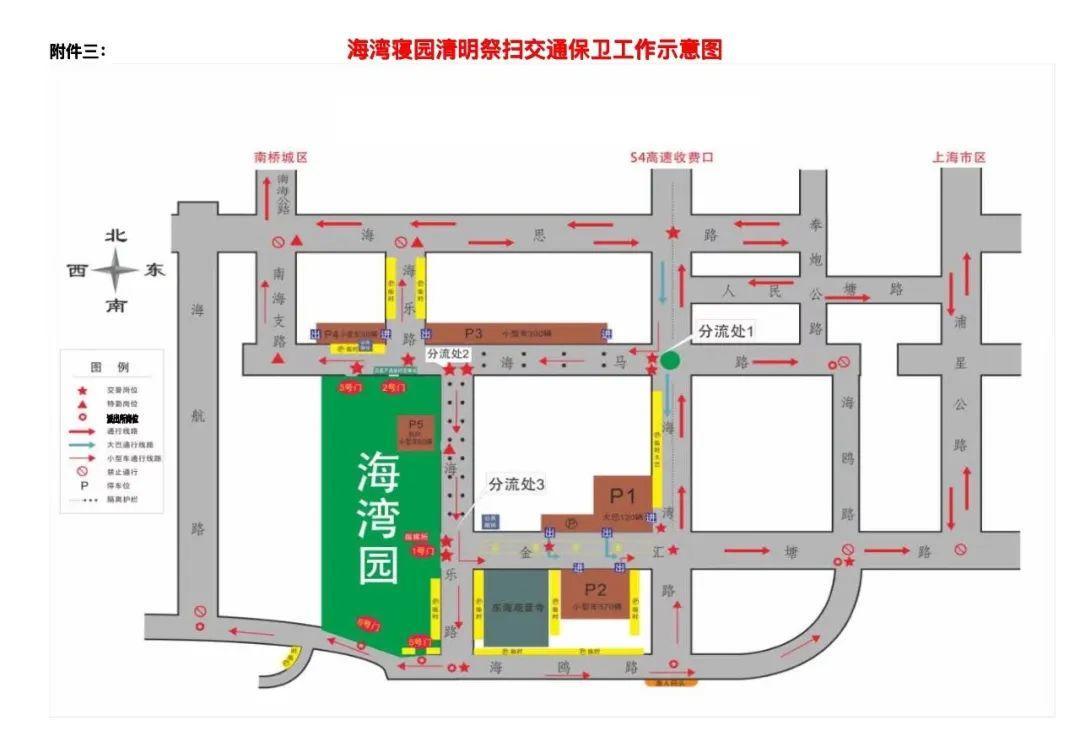 1.海马路实施东向西单向通行(海马/海乐北段以东停车场车辆出墓区走海乐-海思,海马/海乐北段以西停车场车辆出墓区走南海支路-海思);海乐路(南段)实施北向南单向通行;金汇塘路(海湾路-海乐路)实施西向东单向通行。