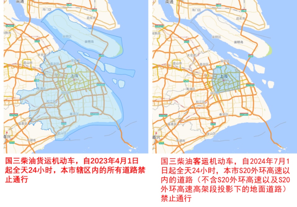 二、自2024年7月1日起,全天禁止国三柴油客运机动车辆在本市S20外环高速以内的道路上(不含S20外环高速以及S20外环高速高架段投影下的地面道路)行驶。