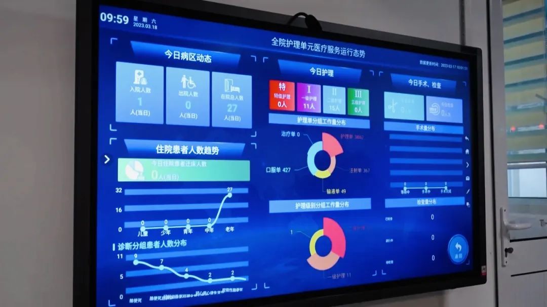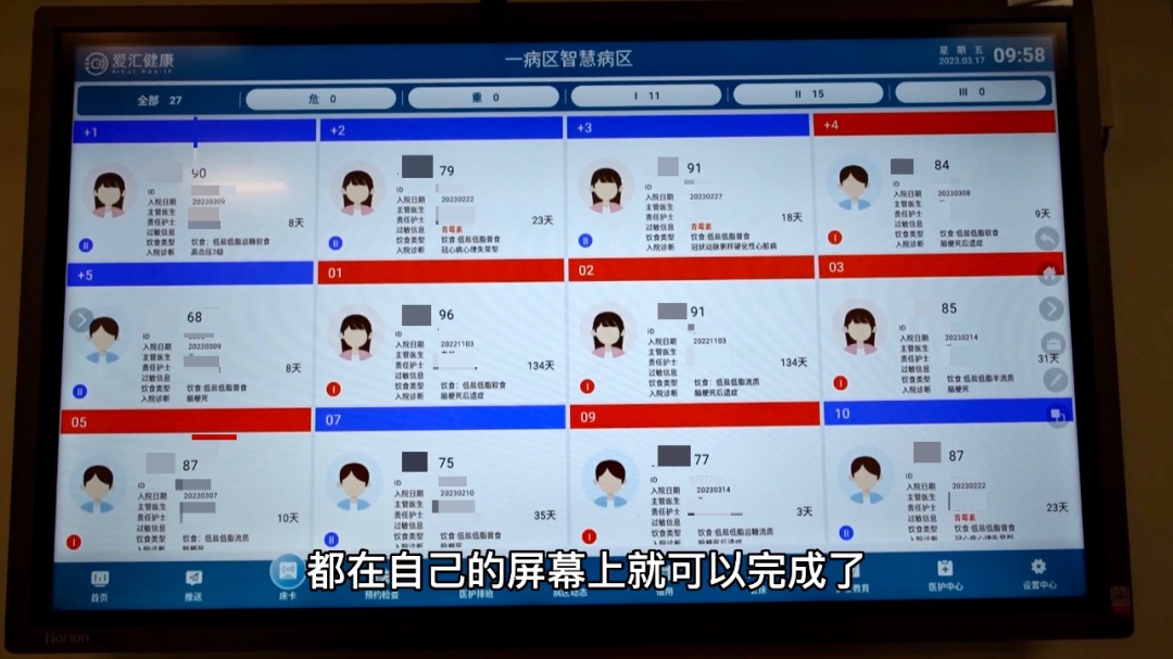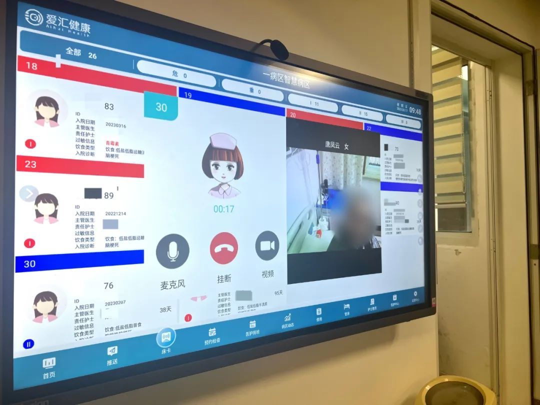 据了解,安置在每个病房床前的“病房交互系统”与护士台的主屏实时联动,除了上述“一键”视频通话功能外,患者还可通过这套智慧病房床旁交互系统实时查询本人的病历、预约检查、住院日费用等内容。同时,应用物联网技术也能够实现对患者生命体征的实时监测,患者的医嘱、护理需求、服药提醒等信息实时显示在护士台的大屏上。