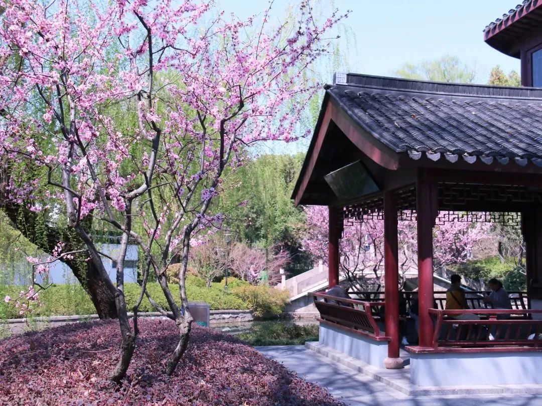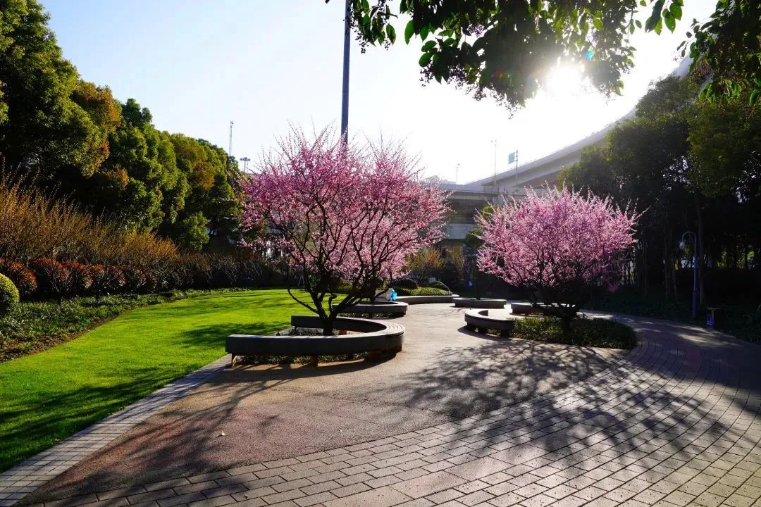 自共和新路洛川东路的闸北公园西门进入,从双枫双院开始便能看到美人梅的身影,漫步至水景附近渐入佳境。一路花红柳绿,景色宜人,配以闸北公园特有古典园林特色建筑,颇有意境。
