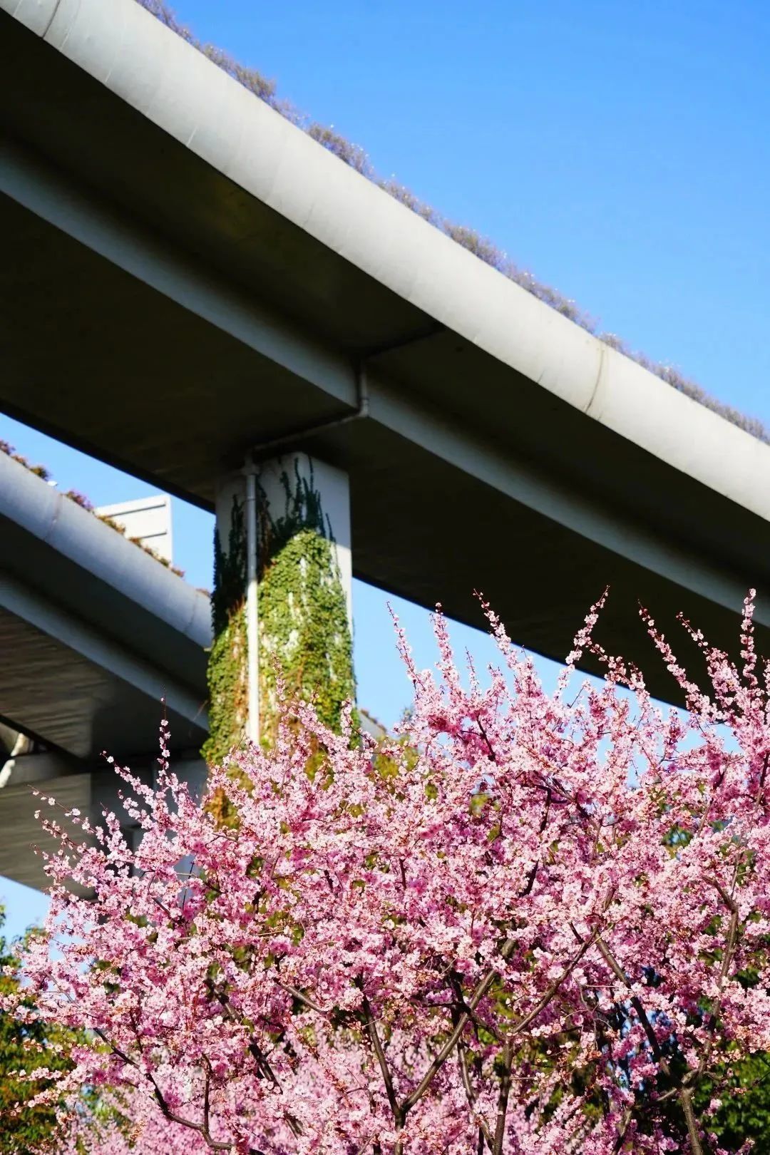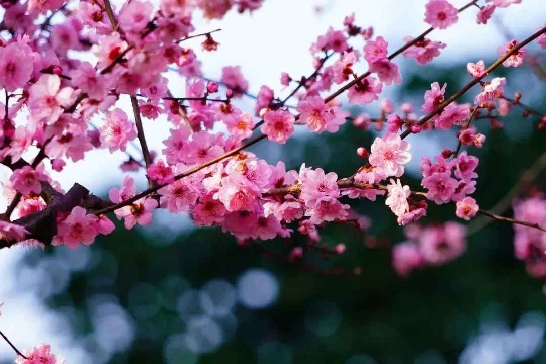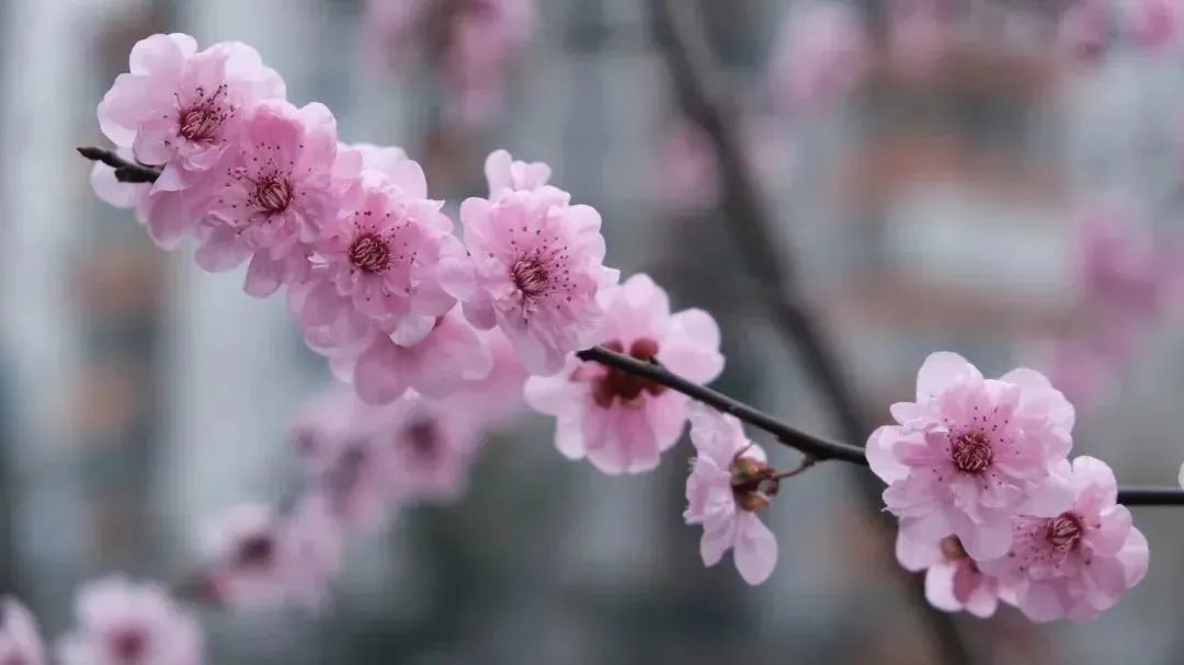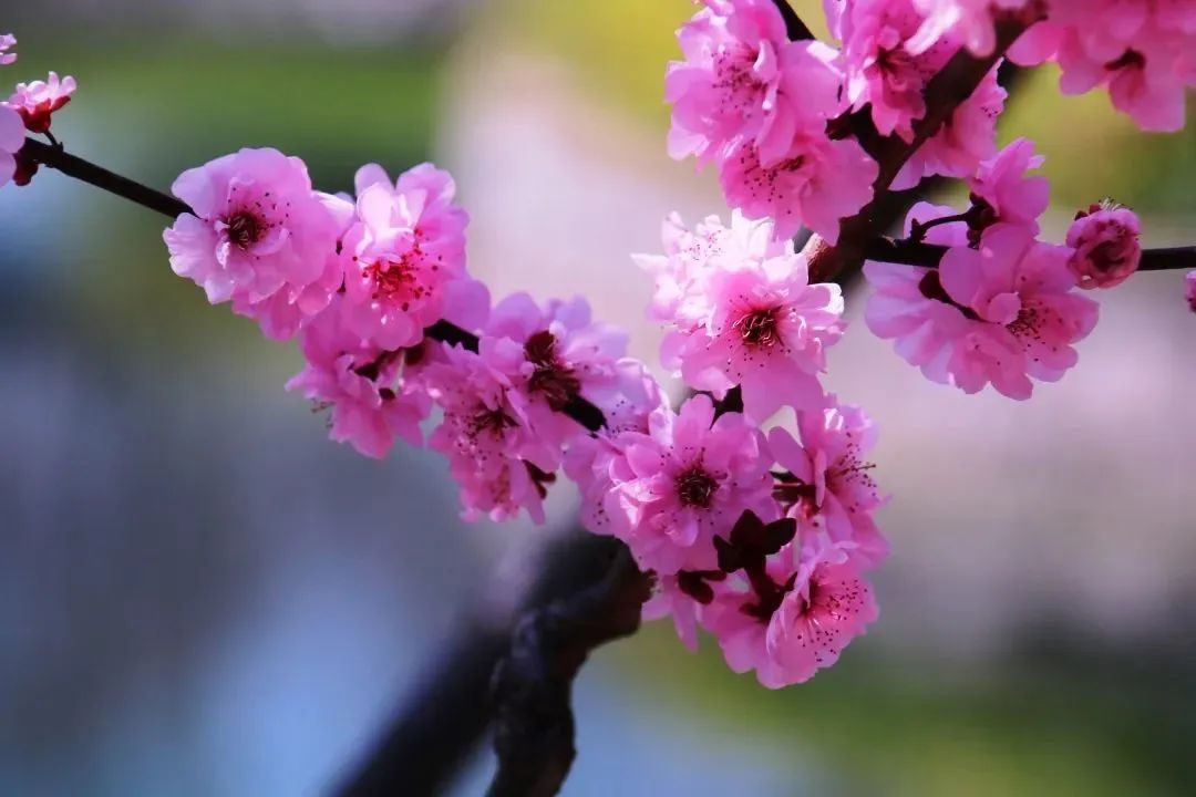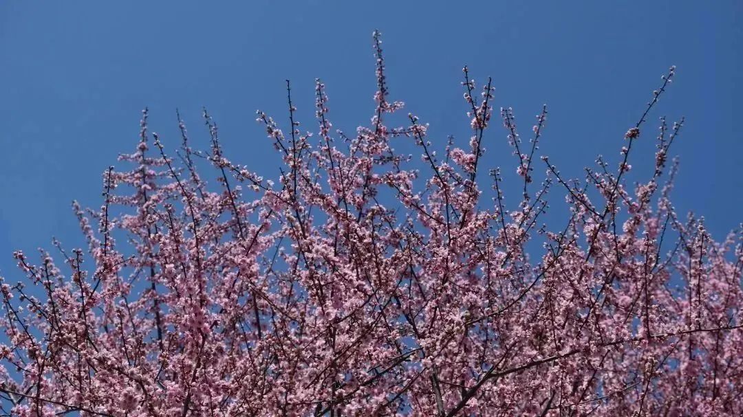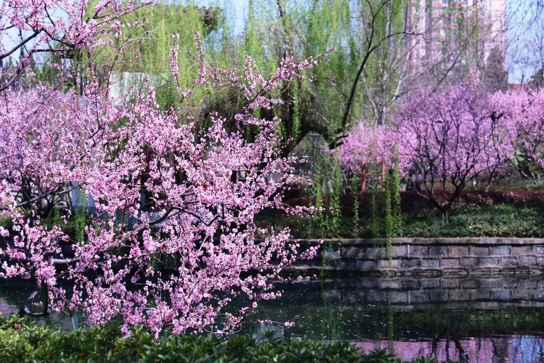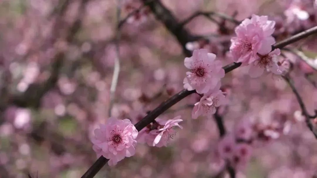 美人梅或成群、或成列,用春日的花容为路人带来一整天的好心情。