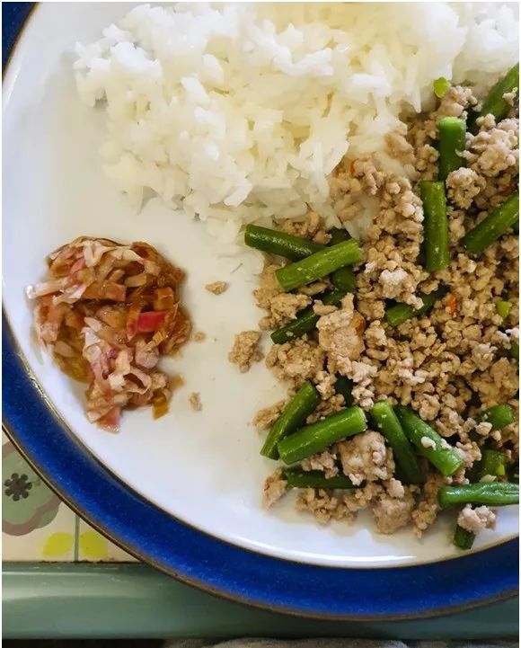 腌制玉兰花配泰式辣猪肉和炒四季豆