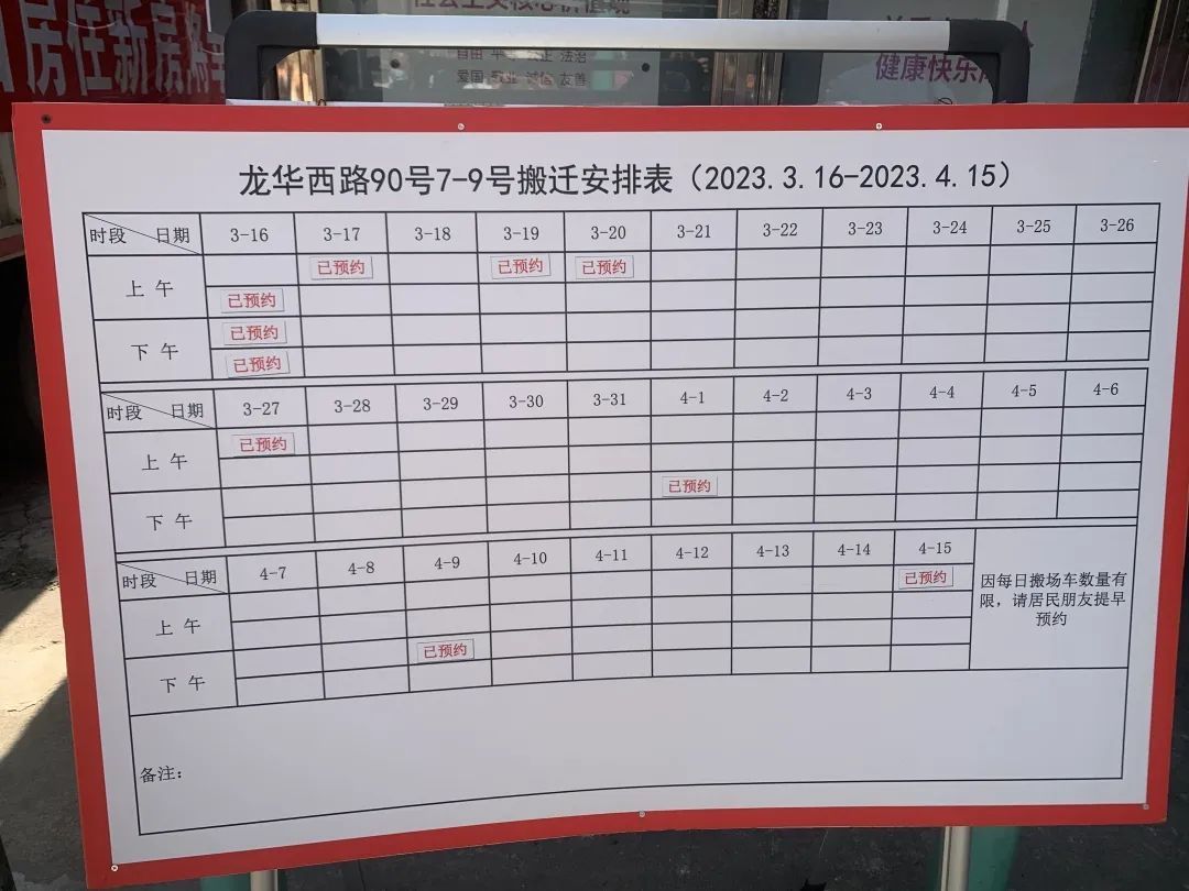 早在3月2日,东蔡居委就向7-9号楼的居民发放外搬通知,并在旧改工作组门口的展板上张贴《龙华西路90弄7-9号搬迁安排表》。据街道工作人员介绍,这个表是给居民预约外搬车辆用的,街道安排免费车辆帮居民搬运家具、家电。从3月16日到4月15日,每天有4个时间段可以预约。