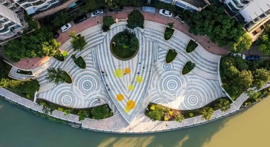 船型广场,乘风破浪。保留原有船型样式,以蔚蓝漩涡图纹为点睛之笔,模拟海浪之态,增添橙色、黄色的明亮色彩,突出亦舟亦水、亦静亦动的效果,使广场颇具乘风破浪之飒。